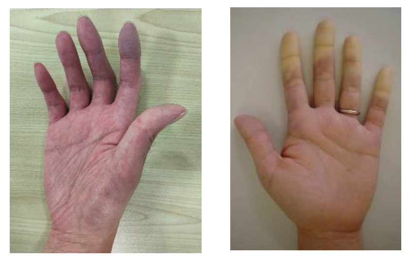 末端血行障害の一種で、冷たい刺激で血行が悪くなり、突然指先が白色や紫色に変わる現象です。