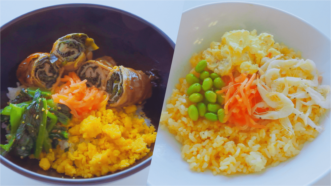 「オリジナルSDGs丼2種(肉巻きWAKAMEのスタミナ丼・とまらない!えび出汁リゾット)