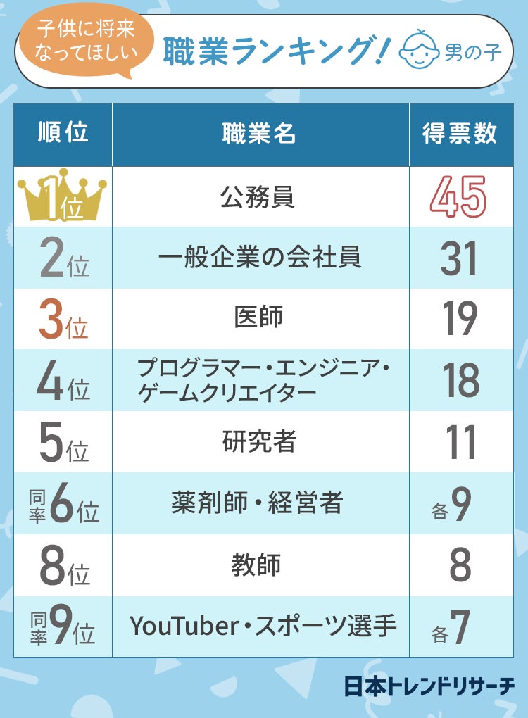 今回は男の子、女の子それぞれに将来なってほしい職業をランキング形式で紹介しました。