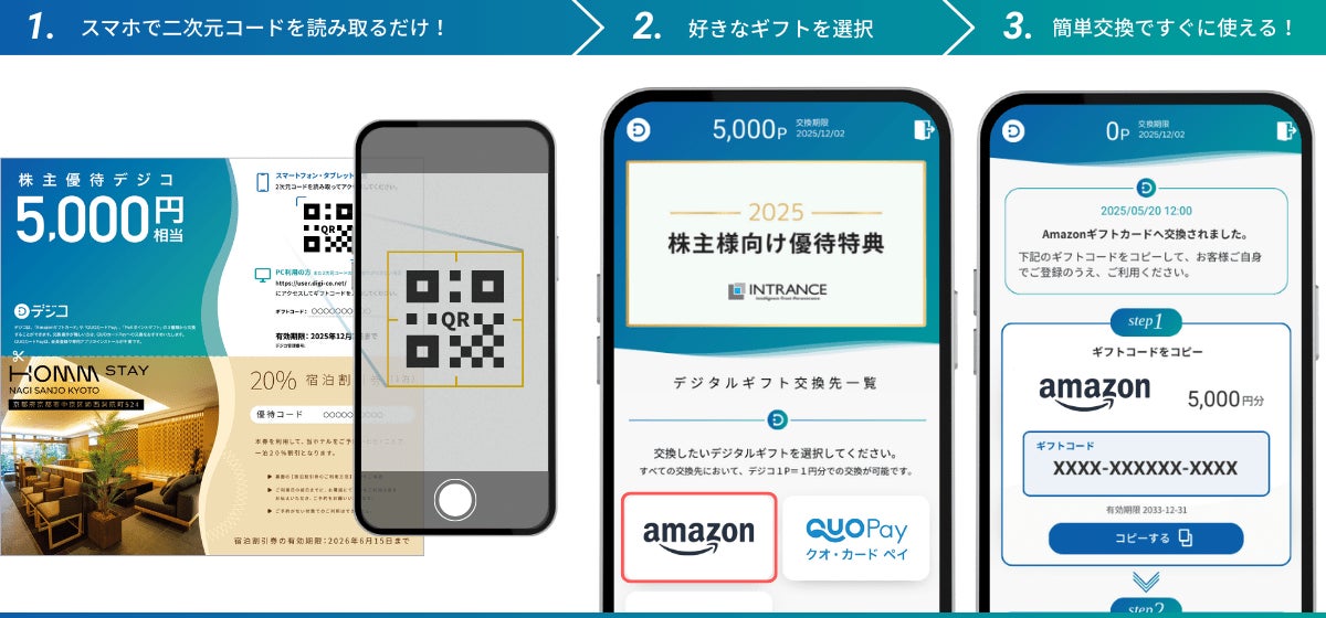 株式会社CARTA HOLDINGSのグループ会社で、マーケティングソリューション事業を展開する株式会社DIGITALIO(東京都港区、代表取締役CEO:古谷 和幸、代表取締役COO:安藤 敦士)は、ホテル・インバウンド事業、不動産事業を展開する株式会社イントランス(東京都渋谷区、代表取締役社長:何 同璽)の2025年6月配布予定の株主優待(2025年3月末権利確定)に、継続して法人向けデジタルギフトサービス「デジコ」が採用されることをご報告いたします。株主優待のデジタル化により、企業側の業務効率化を図りながら、株主の皆さまにはより多様な交換先とスムーズな利用体験を提供できるようになりました。また、「デジコ」の直感的な操作性により、幅広い年齢層の株主の皆さまにも安心してお使いいただけます。