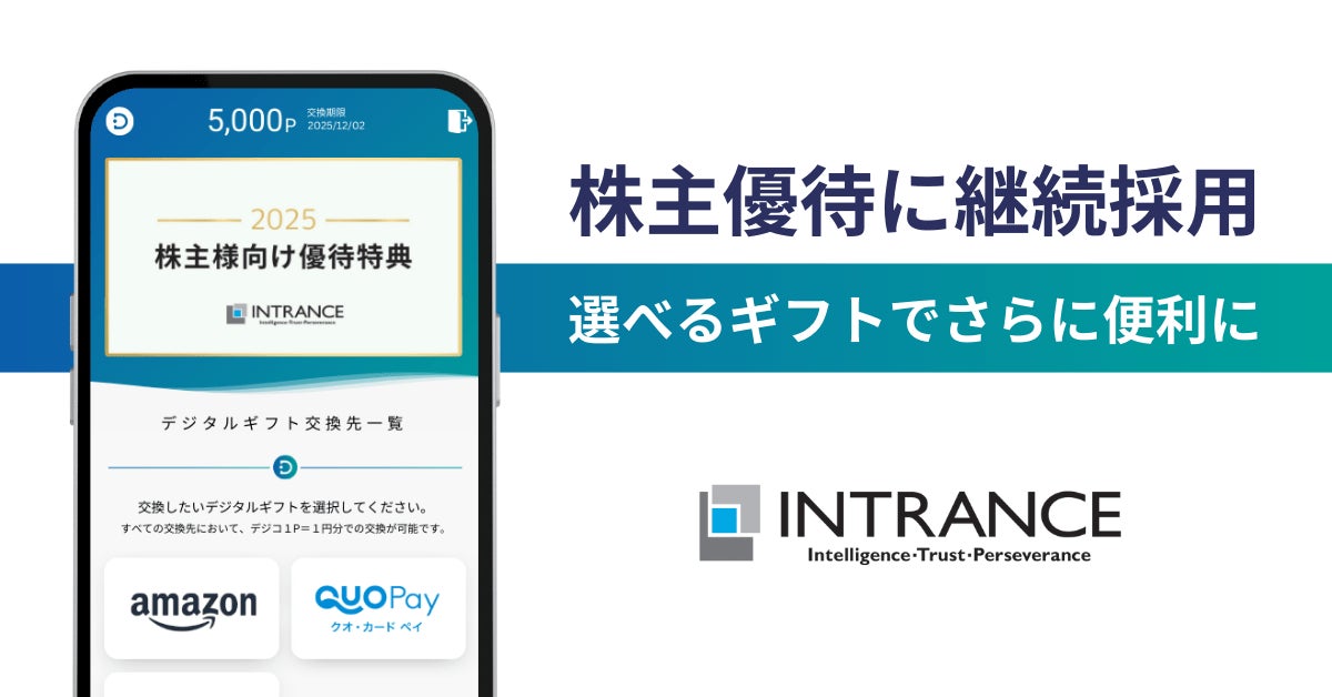 株式会社イントランスは、株主優待の内容を特定の商品券からデジタルギフト「デジコ」へ切り替え、今回で3回目の配布となります。「デジコ」への移行後、初めての配布となった際には、優待内容が変更されたこともあり一定数のお問い合わせをいただきました。