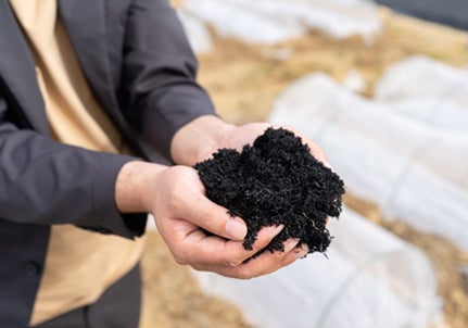 地域の未利用バイオマスの炭化物に対し、TOWINGが保有する土壌由来の微生物群を効率的に選別・培養する技術を用いて実現した土壌改良資材。減化学肥料・有機転換の促進、作物の品質や収穫量の向上など、多くの有効機能を持ち、一般的なバイオ炭の特徴である、「炭素固定による温室効果ガス排出量削減」、「残渣利活用によるサーキュラーエコノミー」に加え、「農地内の土壌微生物群の活性化による土質改善を通じたネイチャーポジティブ」というサステナビリティにおける3つの主要課題すべてに対しての貢献が期待される。
