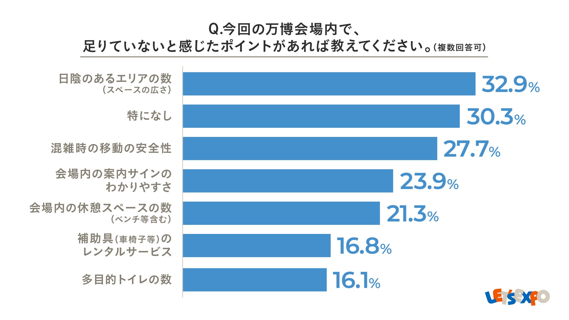 大阪・関西万博の会場内で足りていないと感じた点として最も多かったのは、「日陰のあるエリアの数」(32.9%)でした。次いで「混雑時の移動の安全性」(27.7%)、「案内サインのわかりやすさ」(23.9%)、「休憩スペースの数」(21.3%)が続くなど、快適性や安全性に関する意見が多く寄せられました。また、「補助具のレンタル体制」(16.8%)や「多目的トイレの数」(16.1%)など、アクセシビリティに関する意見も一定数見られました。LET’S EXPOでは、これらの声を今後のユニバーサルツーリズム推進の参考とし、より多様な来場者が安心して過ごせる環境づくりに貢献できるよう取り組みを続けてまいります。