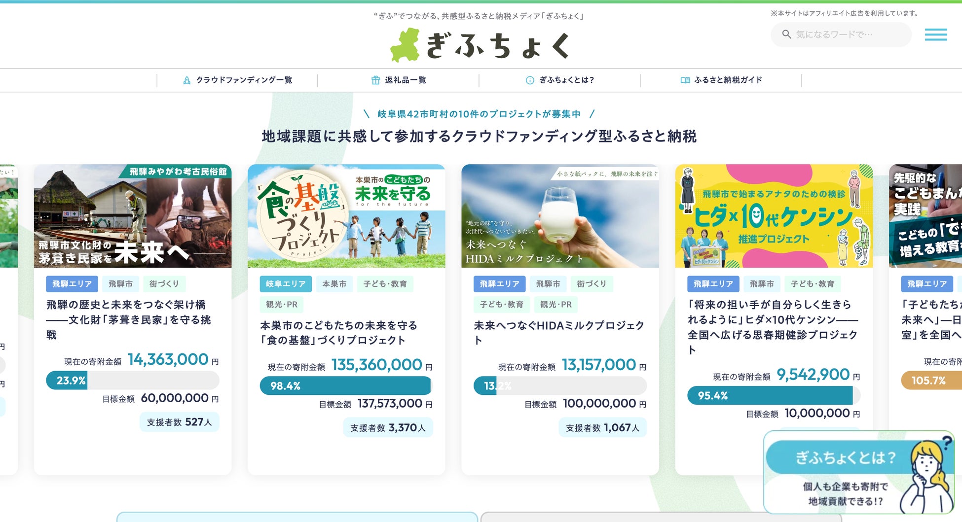 サイトの特徴:2024年10月開設、2025年10月にリニューアル。岐阜県内全42自治体の返礼品情報を掲載し、シビック・クラウドファンディングも掲載するなど、岐阜県のふるさと納税情報をまとめて提供しています。