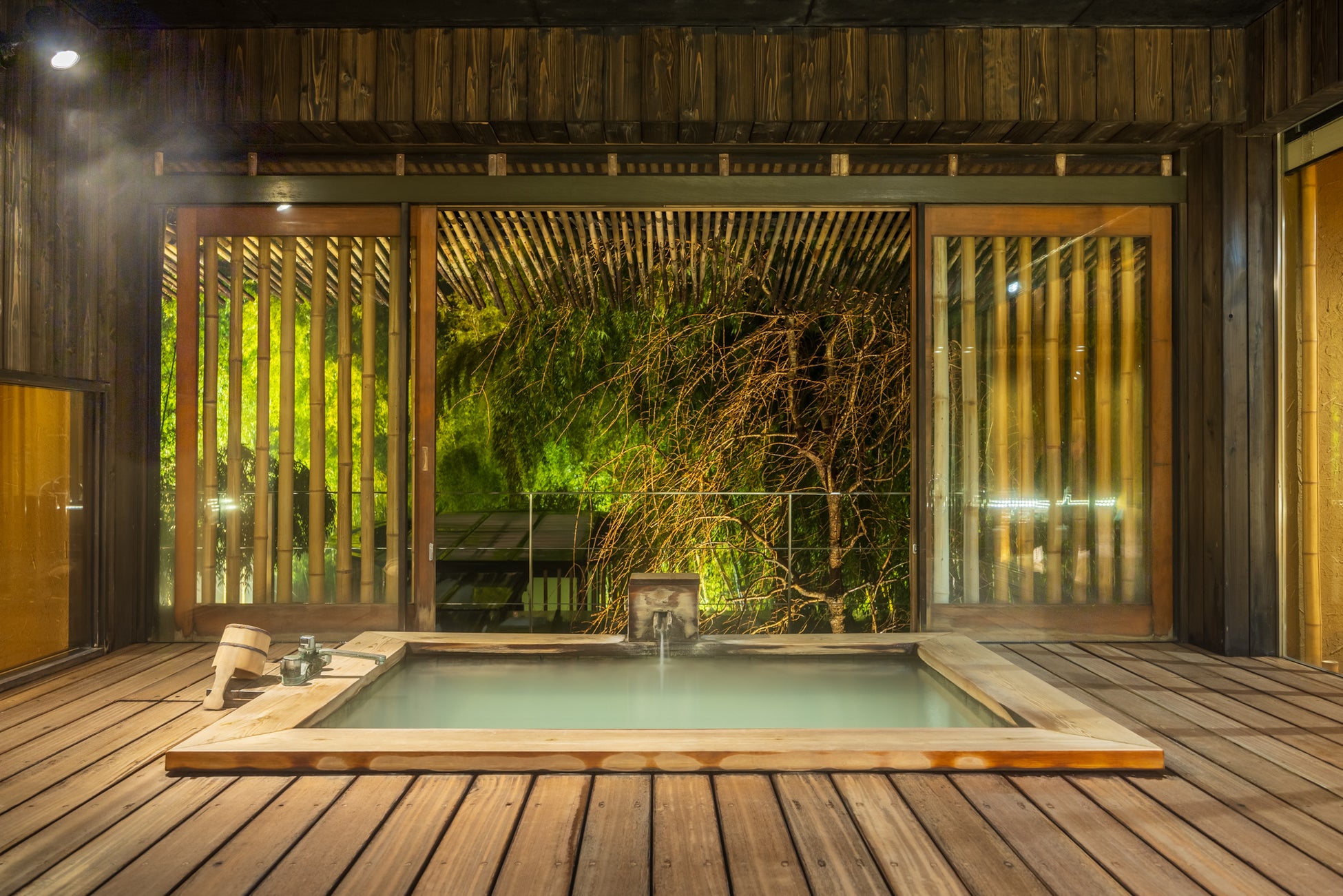 全9室、すべてに露天風呂を備えた贅沢な空間。メゾネットタイプや庭園を望む客室(89㎡~136㎡)など、それぞれに異なる趣を持ち、“竹取の世界”を思わせる幻想的な景色とともにお寛ぎいただけます。