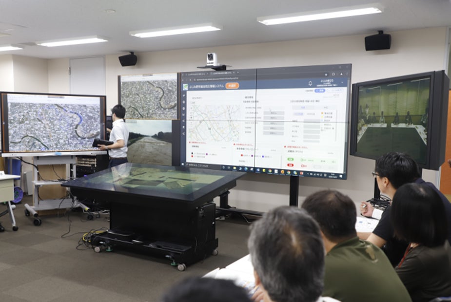 「防災情報共有システム」は、電子作戦テーブル、6面の大画面モニター、電子黒板、タブレットを活用し映像などを一元管理するもの。