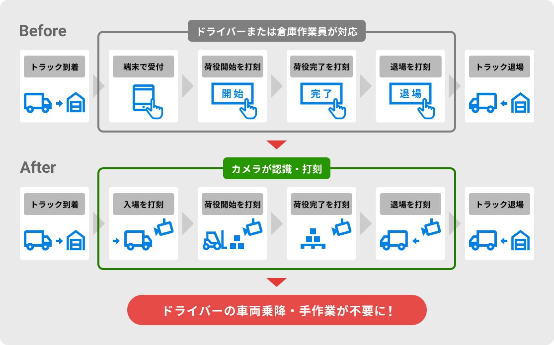 「トラック簿」の導入により、荷待ち・荷役時間の大幅な短縮や、受付作業のデジタル化を通じた業務改善が実現されてきました。一方、倉庫や物流拠点への入退場の打刻や荷役作業の開始/完了の打刻はタブレット端末やスマホアプリなどを通じて行われています。こうした手作業を伴う運用負担改善や、人力によらない正確な打刻データの入力を求める一部の物流拠点から、打刻自動化への声が多く寄せられてきました。こうしたお客様の声にお応えすべく、この度、i-PROのAIカメラソリューションと連携することになりました。
