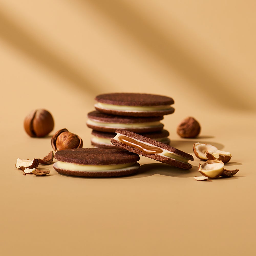 ローストの香ばしい香りとともにまろやかなコクを感じる、とろけるヘーゼルナッツキャラメルをホワイトチョコレートで包み、カカオの奥深い香りを引き立てた繊細で軽やかな食感のココアクッキーでサンドしました。