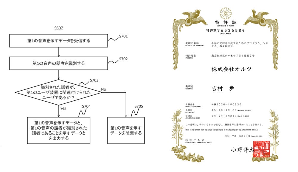 株式会社オルツ(本社:東京都港区、代表取締役:米倉 千貴)は、複数のユーザー装置から入力された音声の話者識別を行い、単一の会話記録として統合する「会話の記録を生成するためのプログラム、システム、および方法」の特許を取得いたしました。本特許は、マルチデバイス環境下での会話を効率的に記録・保存するための技術基盤を確立するものであり、2025年3月21日に特許登録されました。