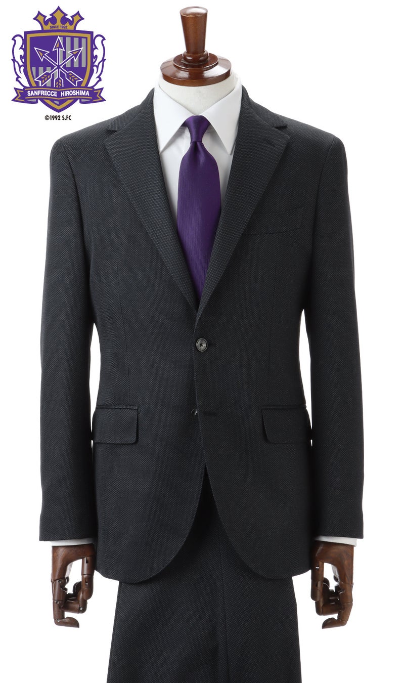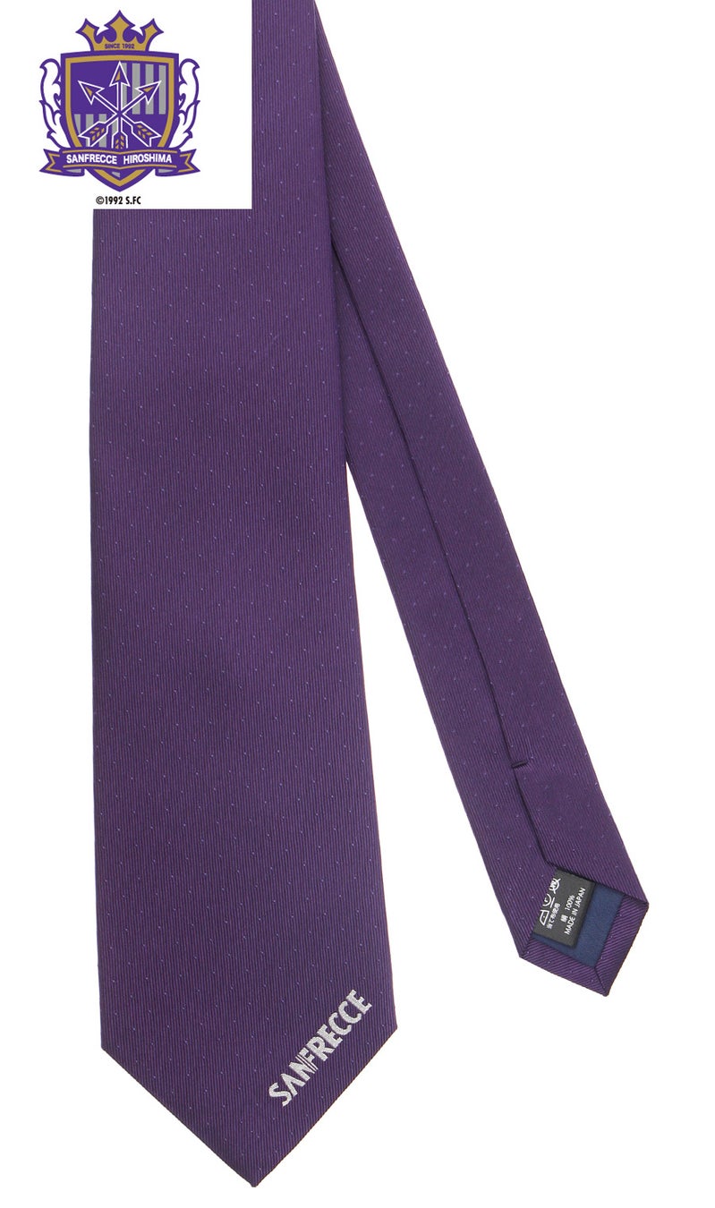 表地は、ストレッチ性に優れたジャージー素材を採用し、快適な着心地とドレッシーさを兼ね備えたネイビーピンドット柄。チームカラーの紫をべースに作製したレプリカネクタイとの組み合わせは相性が良く、スッキリと着こなせます。上着の内側にクラブエンブレムを配置し、見返しのパイピングにはクラブカラーを施した特別仕様です。また、ネクタイの大剣(正面の剣先)の左端には「SANFRECCE」のロゴが刺繍されています。