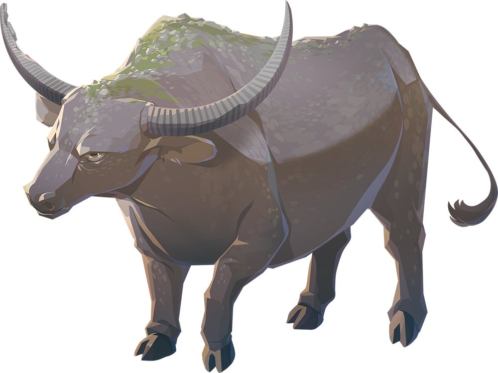 一本の角は途中で折れ、体のあちこちには傷跡が