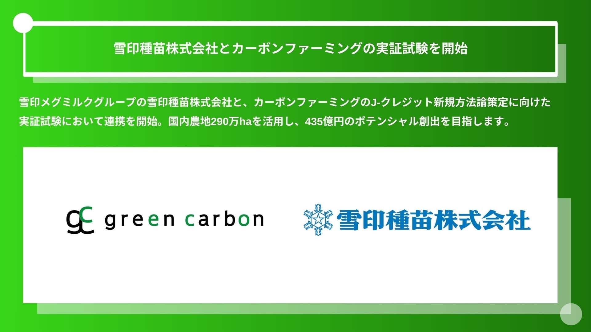 ネイチャーベースのカーボンクレジット創出販売事業を展開するGreen Carbon株式会社(代表取締役:大北潤、以下Green Carbon(読み;グリーンカーボン))は、雪印メグミルクグループの雪印種苗株式会社(代表取締役社長 笠松 宏一、以下、雪印種苗)とカーボンファーミング※1のJ-クレジット新規方法論策定に向けた実証試験において連携(以下、本連携)を開始。国内農地290万ha(水田+畑+耕作放棄地、果樹や牧草地を除く)を活用し、435億円のポテンシャル創出を目指します。