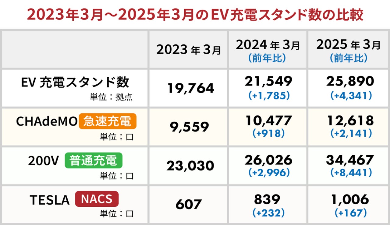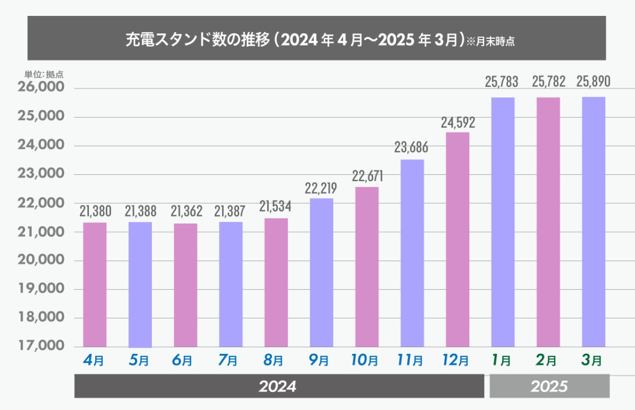 経済産業省は「2030年までに30万口の充電器を設置する」(※1) という目標を掲げていますが、実際のEV充電スタンド数はどのように変化しているのか、2024年4月から2025年3月までの一年間の推移をまとめました。