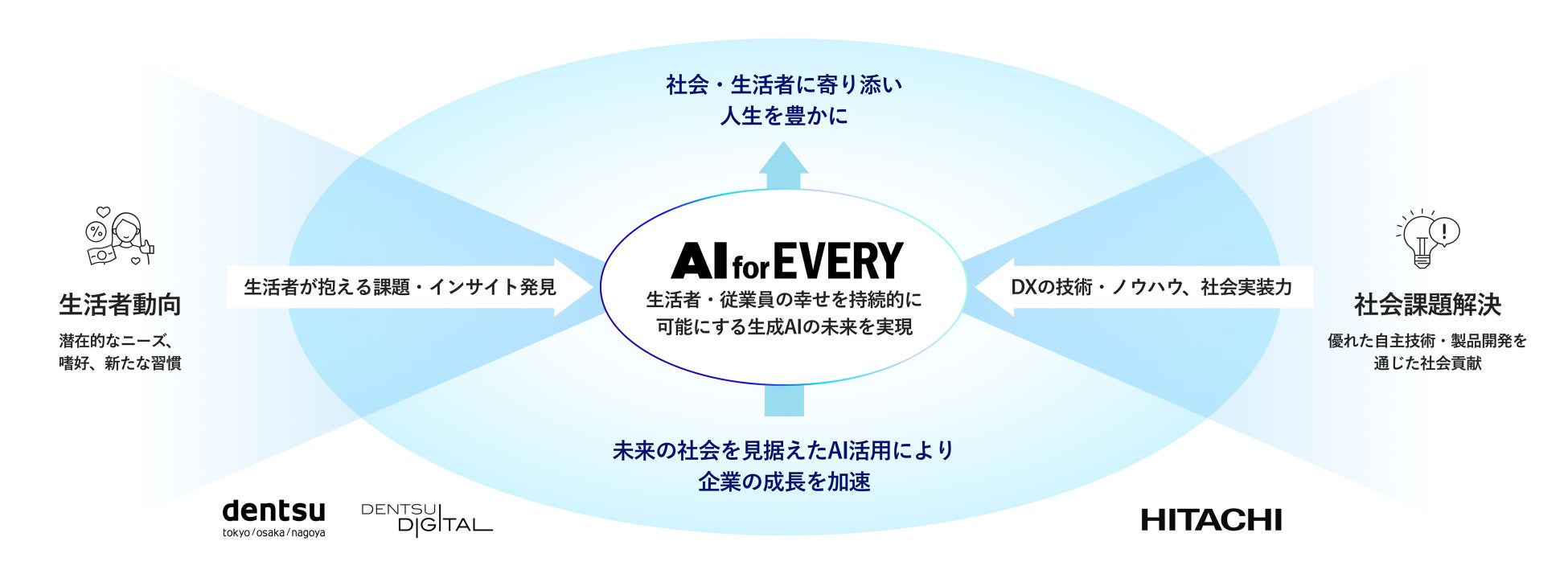 株式会社電通(以下、電通)、株式会社電通デジタル(以下、電通デジタル)、株式会社日立製作所(以下、日立)は、このたび、生成AI領域で戦略的に協業していくことを合意し、生活者に寄り添った革新的な生成AIサービスの検討・提供を共同で行うプロジェクト「AI for EVERY」を立ち上げました。