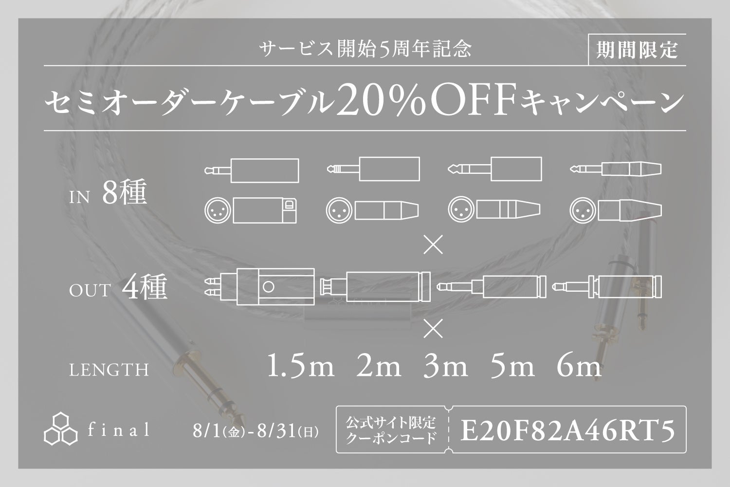 国内オーディオメーカー株式会社final(代表:細尾 満、本社:神奈川県川崎市)は、ご自身の使用機材や環境に合わせて、ヘッドホン用のシルバーコートケーブルをカスタマイズできる「セミオーダー販売」のサービス開始から5周年を記念して、対象ケーブルが期間限定で20%OFFになる特別キャンペーンを開催いたします。