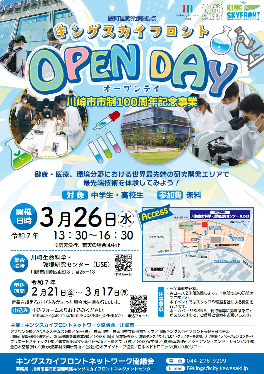 世界的な成長が見込まれるライフサイエンス・環境分野を中心に、世界最高水準の研究開発から新産業を創出するオープンイノベーション拠点である「殿町国際戦略拠点キングスカイフロント」において、市制100周年記念事業として、中学生、高校生を対象としたイベント「キングスカイフロントOPEN DAY」を3月26日(水)に開催いたします。