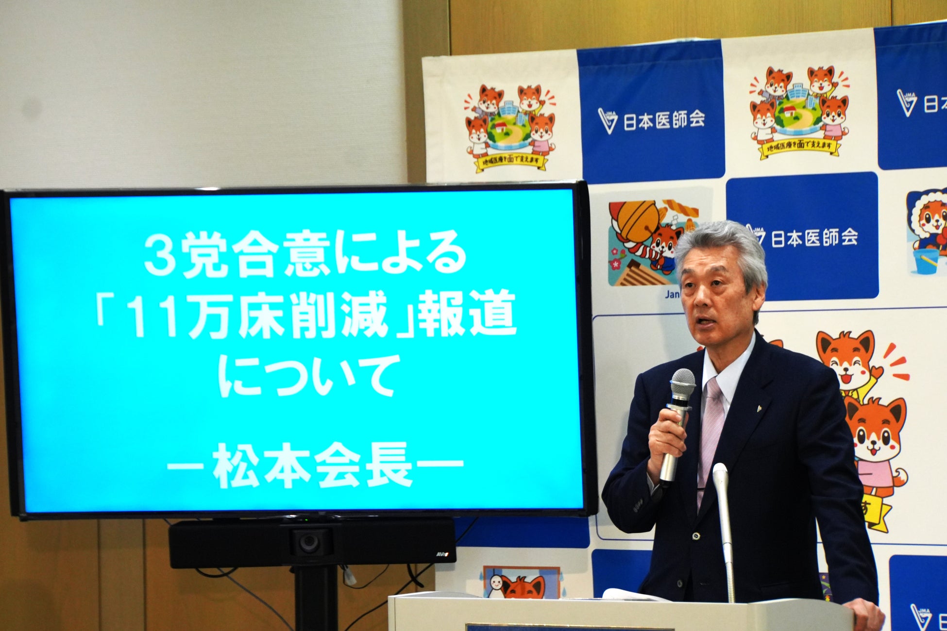 日本医師会ではその取り組みや考えを説明するために定例記者会見を開催していますが、今回のテーマは、(1)3党合意による「11万床削減」報道について、(2)財務省財政制度等審議会「激動の世界を見据えたあるべき財政運営」について、(3)第19回国民推進協議会総会の開催について、(4)今年の夏の熱中症対策についての4つでした。