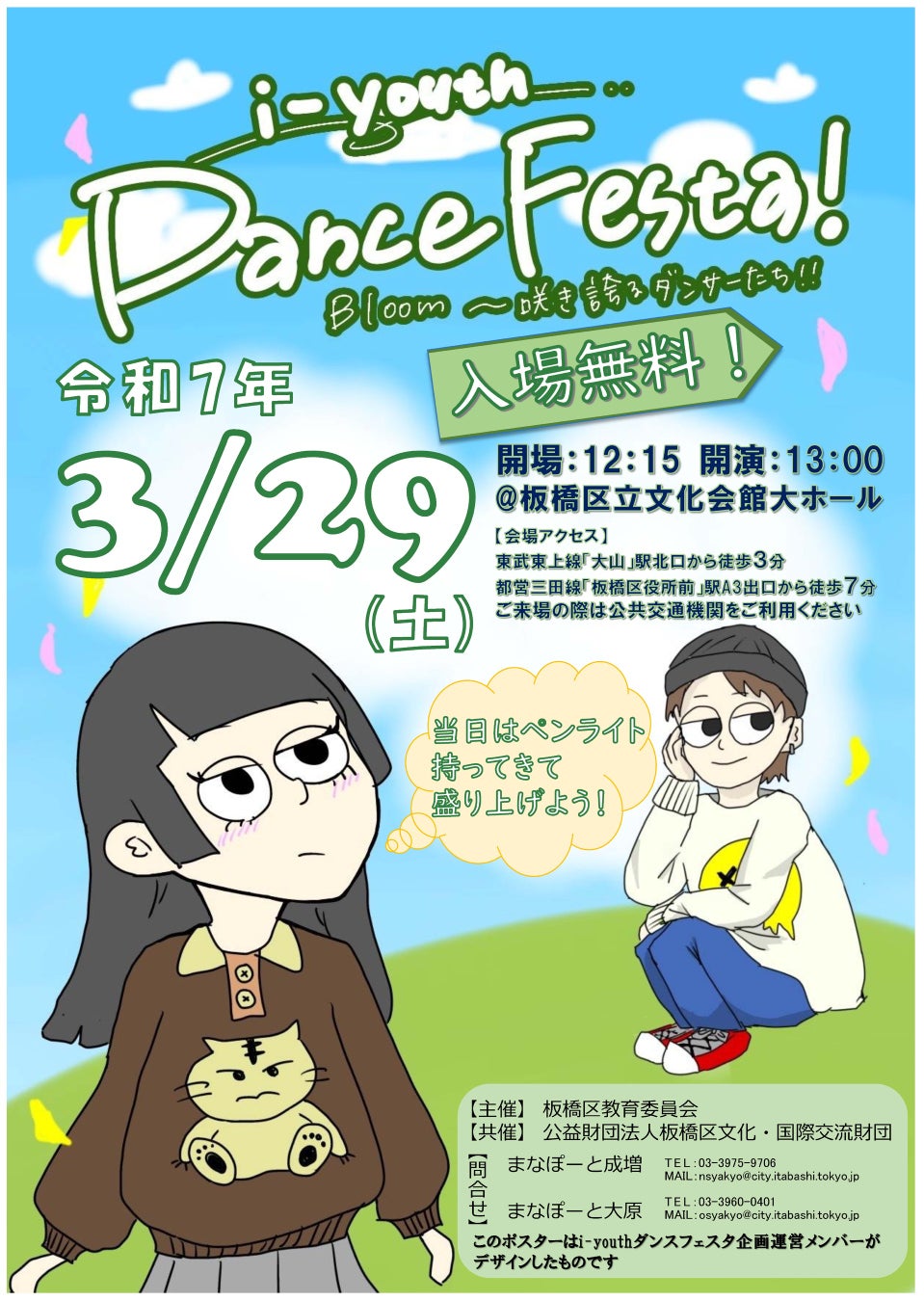 板橋区教育委員会は、令和7年3月29日(土)午後1時から板橋区立文化会館大ホールで「i-youthダンスフェスタ」を開催します。中高生等の若者が企画運営メンバーとして企画の準備や当日の運営を行っており、企画運営メンバーをはじめとした若者の意見を反映させたダンスイベントとなっています。