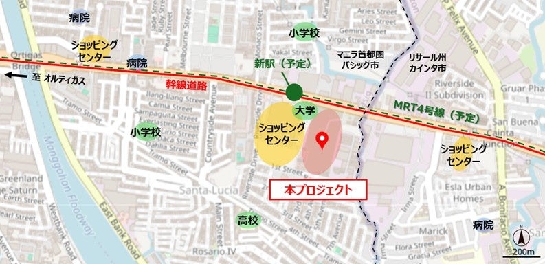 マニラ首都圏は、約1,400万人の人口を抱えるフィリピンの経済中枢エリアであり、マカティ・BGC(ボニファシオ・グローバルシティ)・オルティガスなどが主要なビジネス地区として挙げられます。本プロジェクトは、オルティガスなどに接続する幹線道路に面しており、近隣のショッピングセンターからは多くのバスが行き交っているため、これらの地区へアクセスしやすい立地となります。周辺には、商業施設・教育機関・医療機関が多く揃っており、日常生活を支える環境が整っています。また、敷地北西にはオルティガスへ繋がる新しい鉄道路線であるMRT4号線の新駅が建設される予定※であり、将来的にはさらに利便性が高まる見込みです。