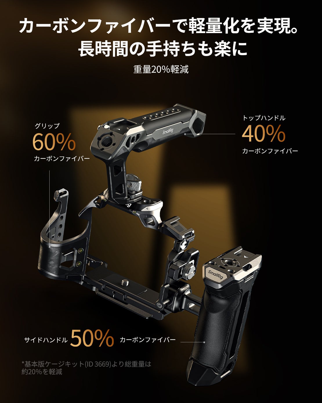 「Rhinoceros」ケージキットシリーズはカーボンファイバーを採用してケージのコンパクト性を追求しています。ハンドルは軽量と同時にPUレザーのハイクオリティ材料により、肌触りが良く、長時間の使用にも耐える、極上的な握り心地を体験できます。