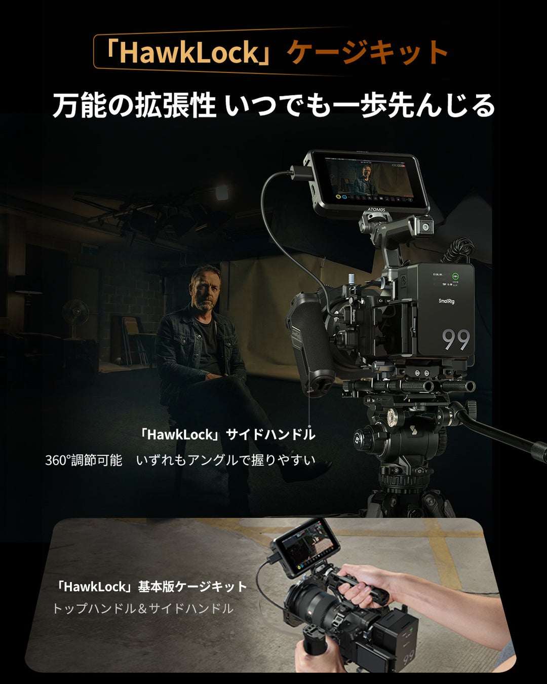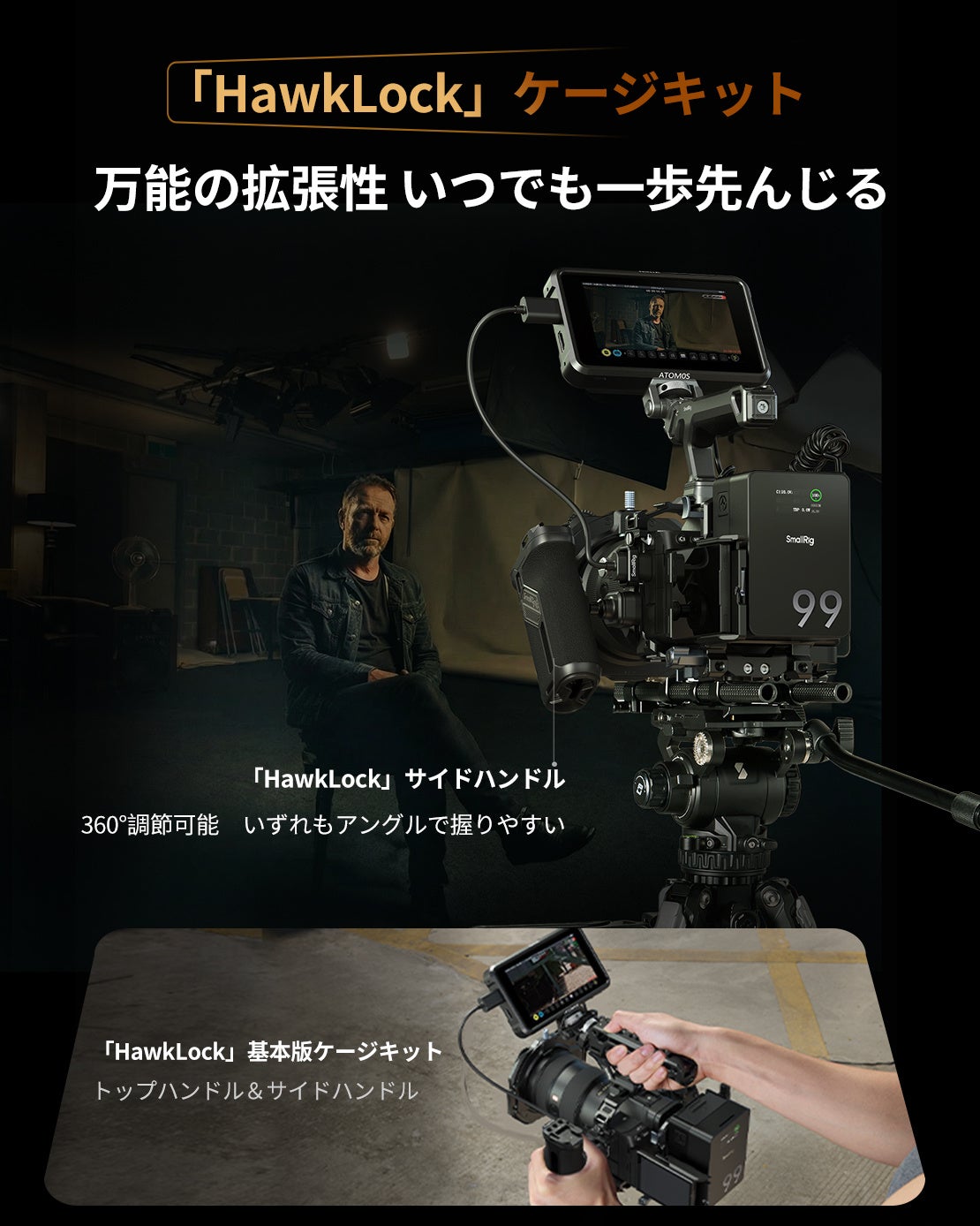 「HawkLock」ケージキットは、ワンタッチのクイックリリース機構で一秒での作業開始を実現し、専用トップハンドルとサイドハンドルを備えたシステム拡張で完全な操作性を提供します。3点固定ロックでカメラをしっかり保護し、画面のブレを防止。豊富な拡張性で、様々なグリップ、マイク、アームなどへの接続が自由、さらに、ハンドル、三脚、DJI スタビライザーへのシーン切り替えを迅速化する。撮影現場に、本当の一歩先んじることを実現します。