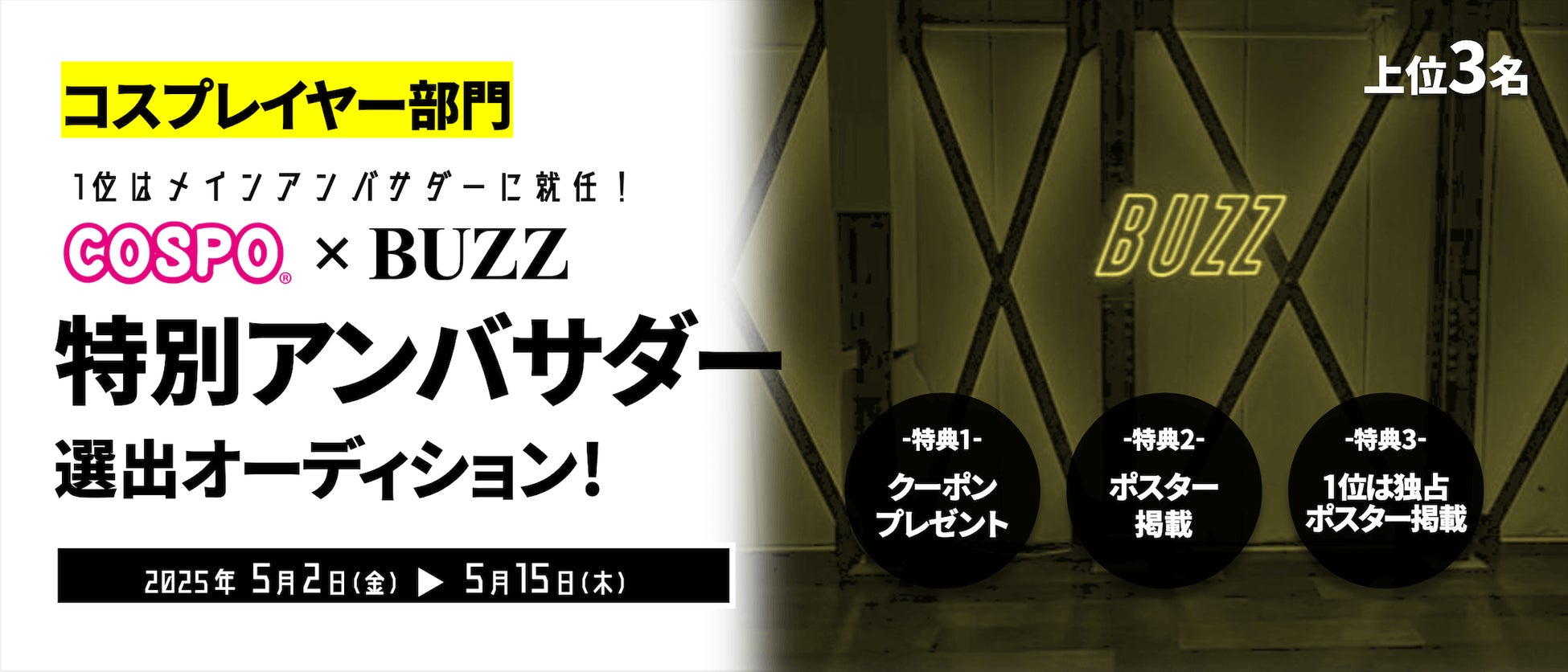 本企画は「コスプレイヤー部門」と「VTuber部門」の2部門で開催され、各部門上位3名が「COSPO×STUDIO BUZZ特別アンバサダー」に就任します。選出されたアンバサダーには、BUZZスタジオで使えるクーポンや、スタジオ内へのポスター掲示などの特典が用意されています。特に各部門1位に選ばれた方は「メインアンバサダー」として、STUDIO BUZZ店舗内に独占ポスターが掲示される特典があります。