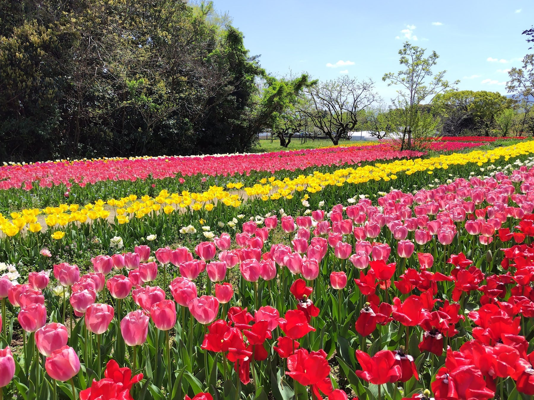 約100品種のチューリップや、ネモフィラなどの春の花々が公園を彩ります。