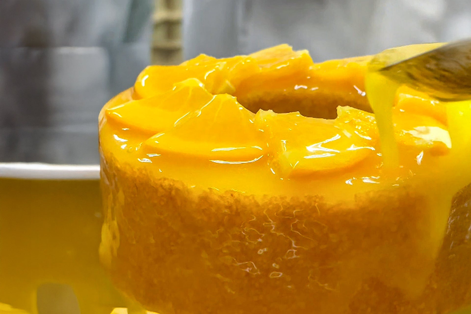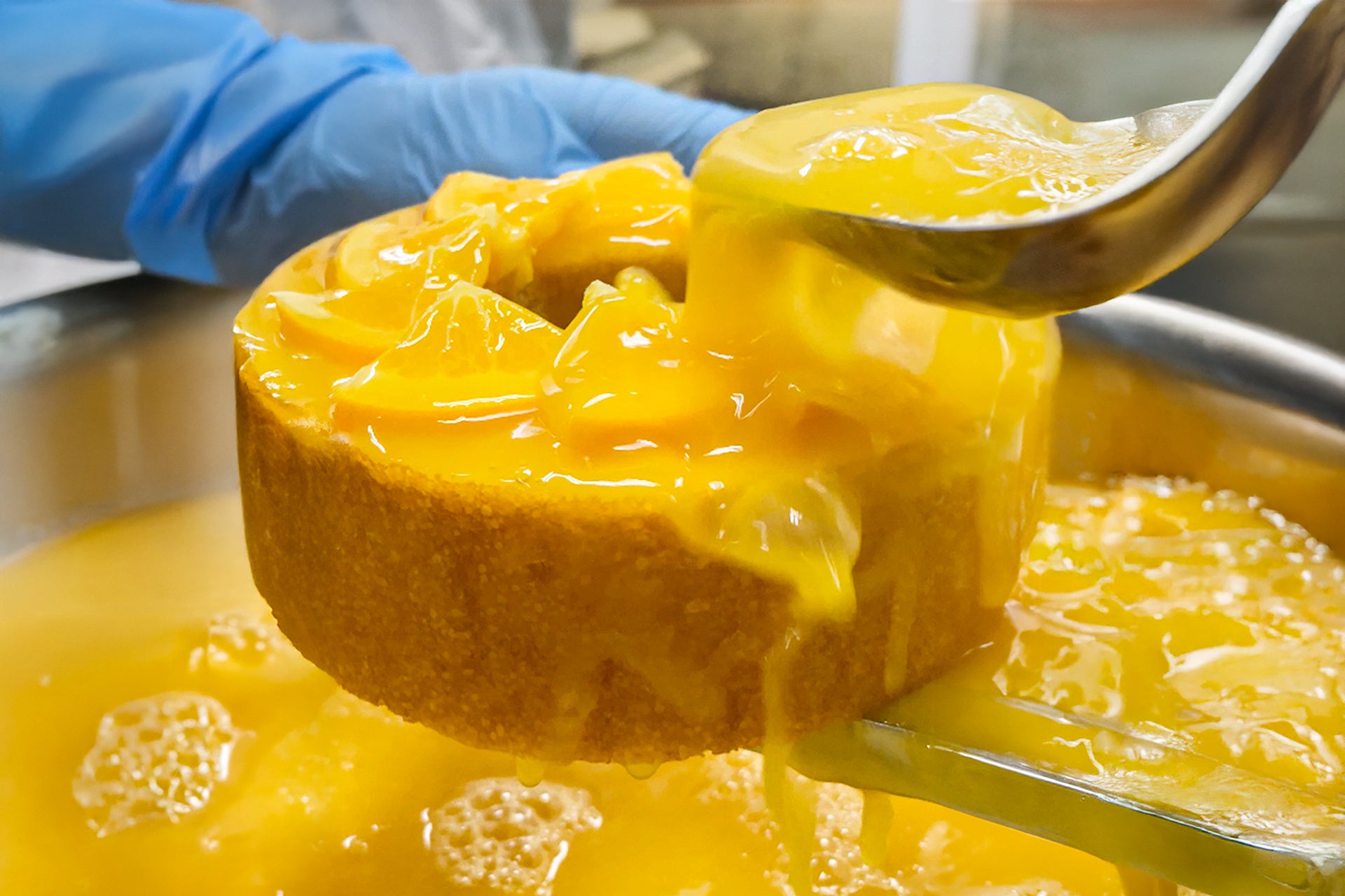 オレンジを飾った直後には、すかさず特製ソースでコーティング。