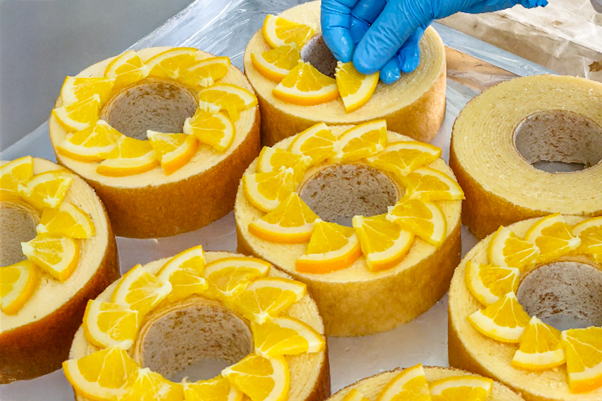 カットしたオレンジは、職人が一枚一枚、丁寧にあしらいます。