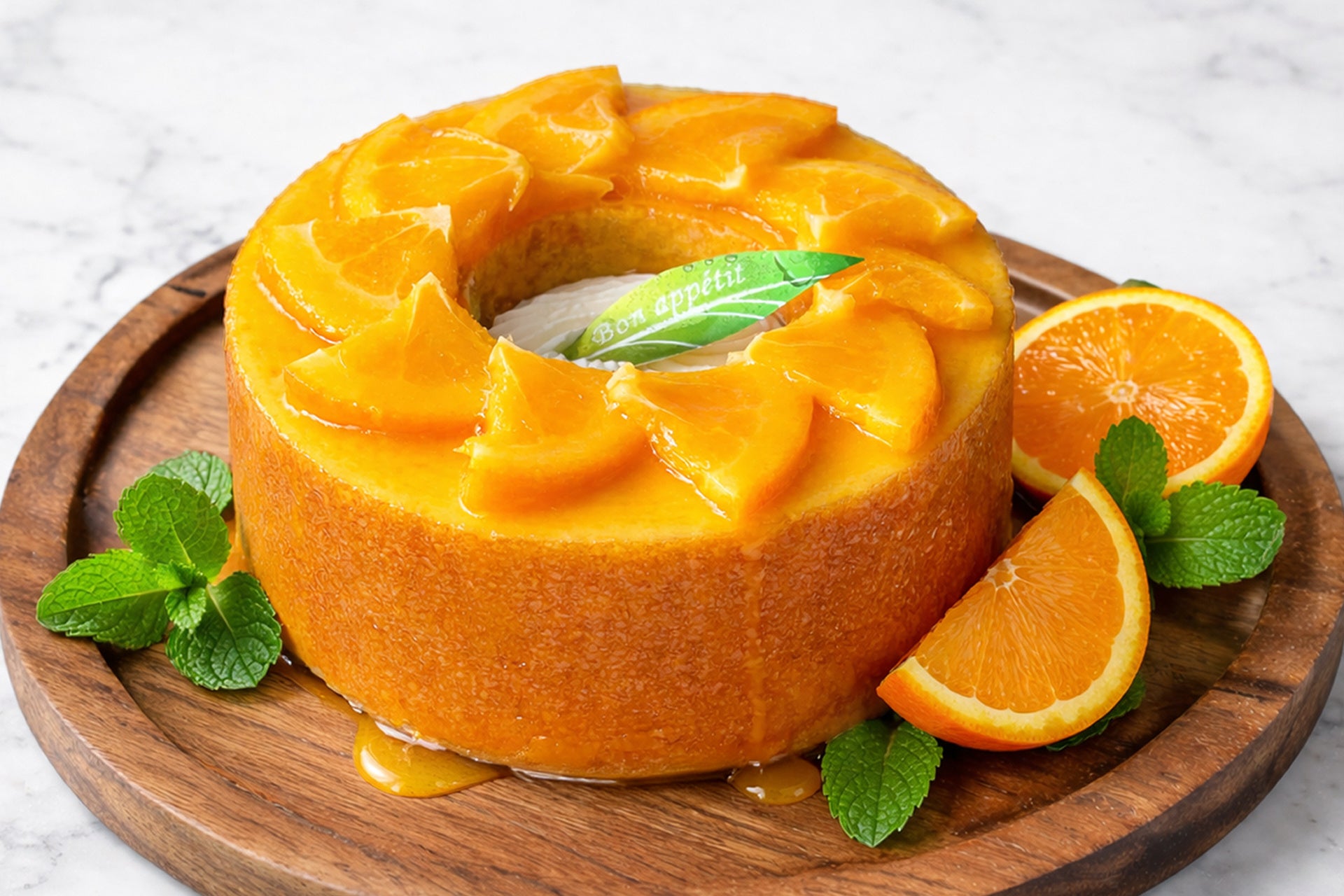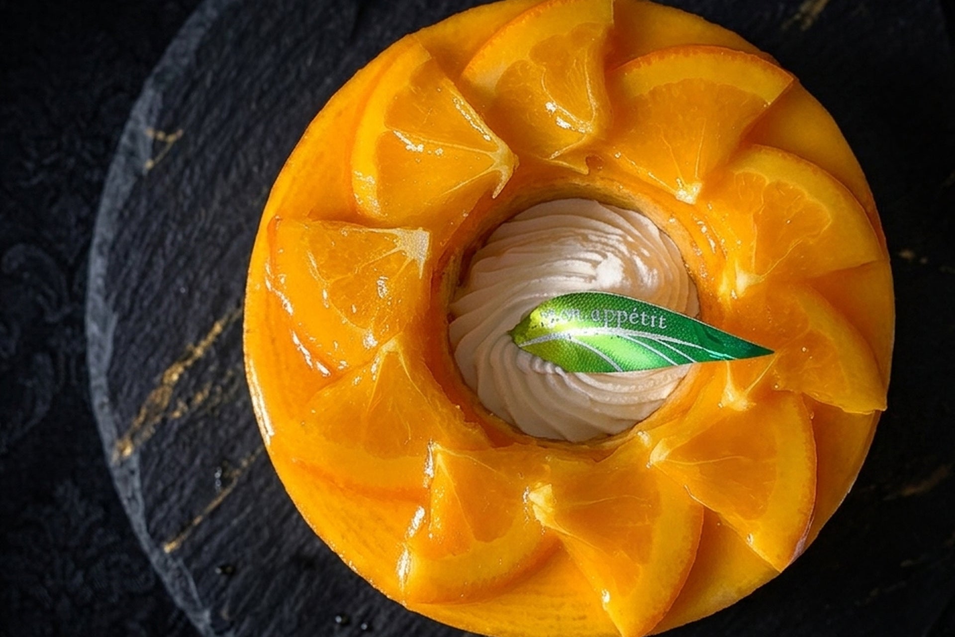 透き通るようにジューシーなオレンジの果肉とソースは、光を受けてきらめき、思わず見とれてしまうほどの美しさ。ひとつひとつ丁寧にカットされた断面は、まるで宝石のファセット(カット面)のように繊細で、透明感あふれる表情を見せてくれます。