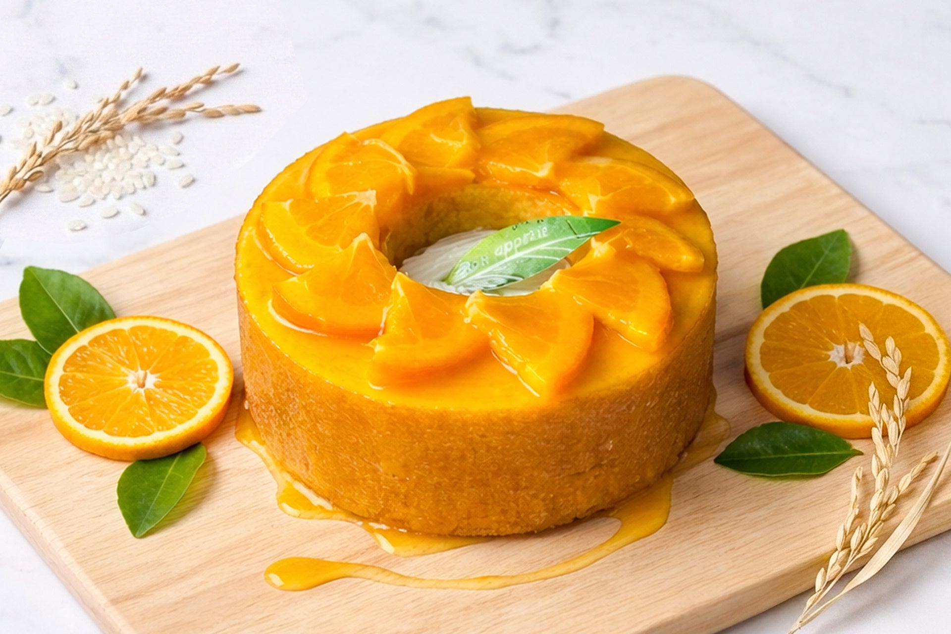 千葉県産米粉を使用したしっとり・もっちり食感が楽しめる、米粉100%のグルテンフリー・バウムクーヘンに、オレンジスライスを華やかに重ねました。その上から、旬のバレンシアオレンジ果汁100%を贅沢に煮詰めた、フルーティーな特製ソースを「これでもか!」というほどたっぷりと。さらにバウムの中心には、甘みと酸味のバランスが絶妙な、濃厚かつ爽やかなチーズクリームを絞り入れました。