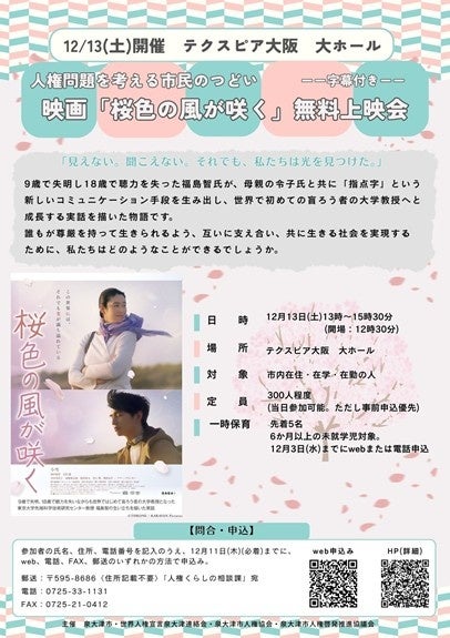 泉大津市では、人権週間(12月4日〜10日)の関連企画として、令和7年12月13日(土)に、「人権問題を考える市民のつどい」映画『桜色の風が咲く』上映会 を開催します。