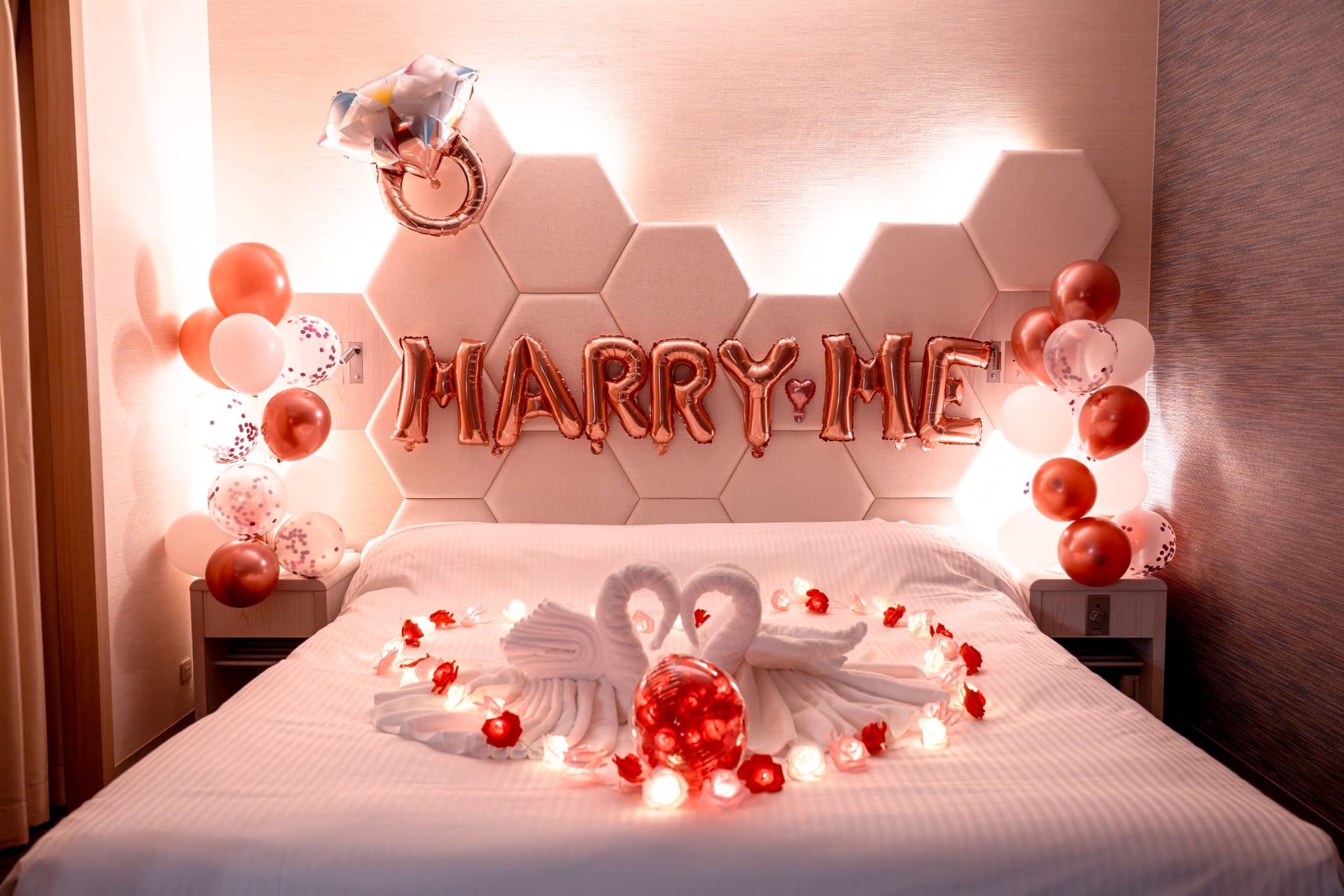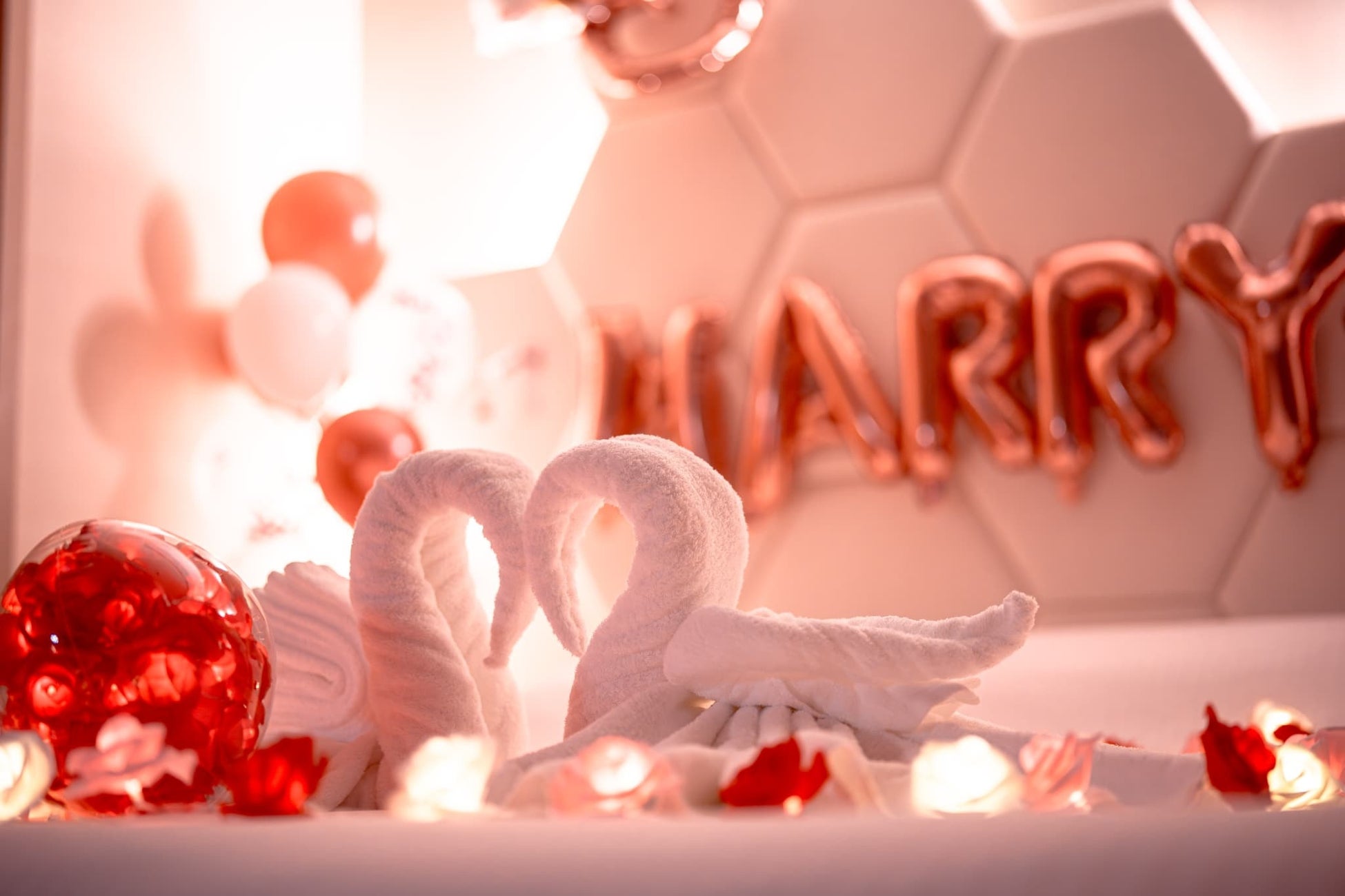 大切な想いを伝えるプロポーズの瞬間を、当館のモダンな客室を活かした特別な空間演出のデコレーションです。いつまでも心に残る最高の思い出となるバルーン演出をご用意しています。ご要望に合わせて記念日[ANNIVERSARY]の文字バルーンの装飾も対応可能です。