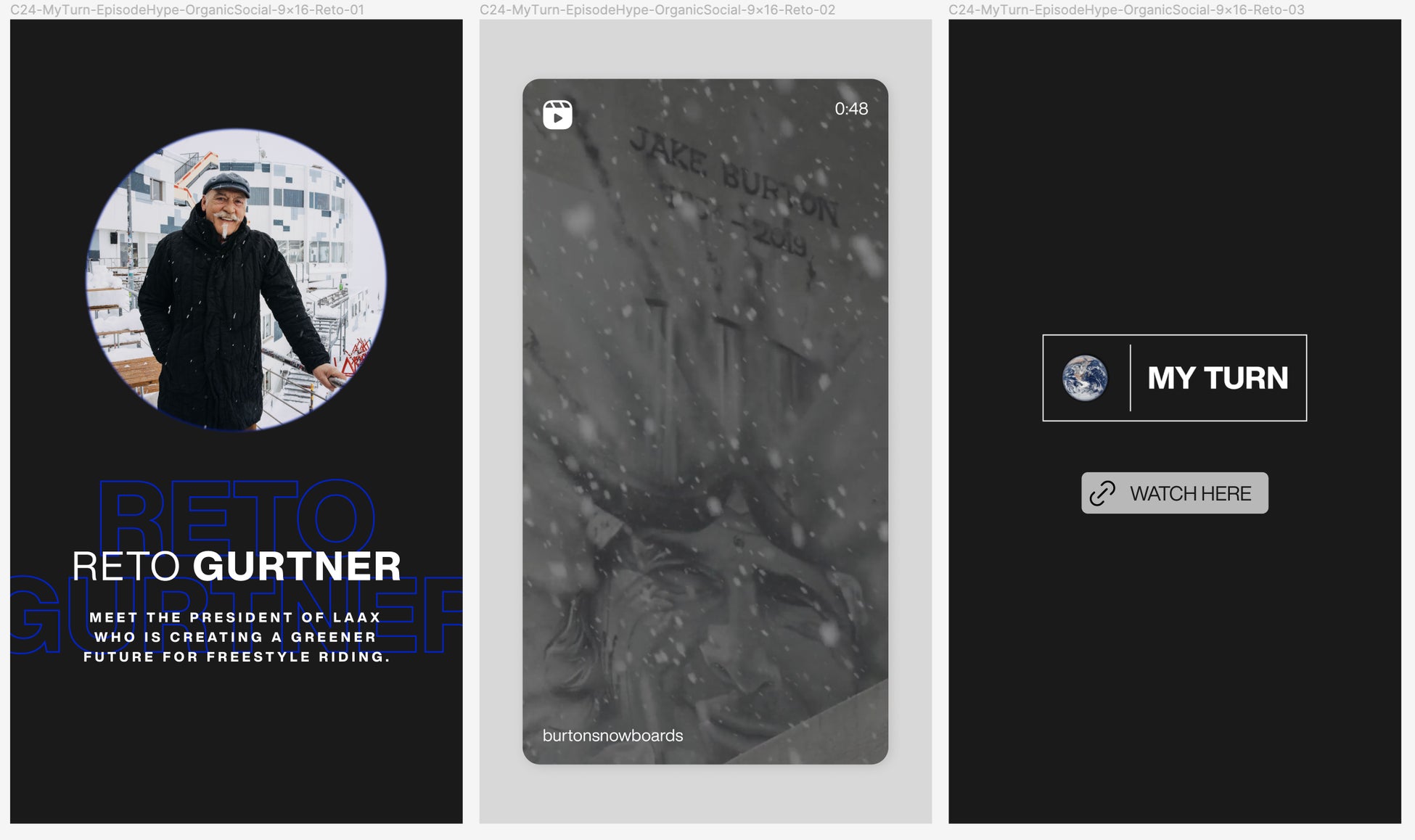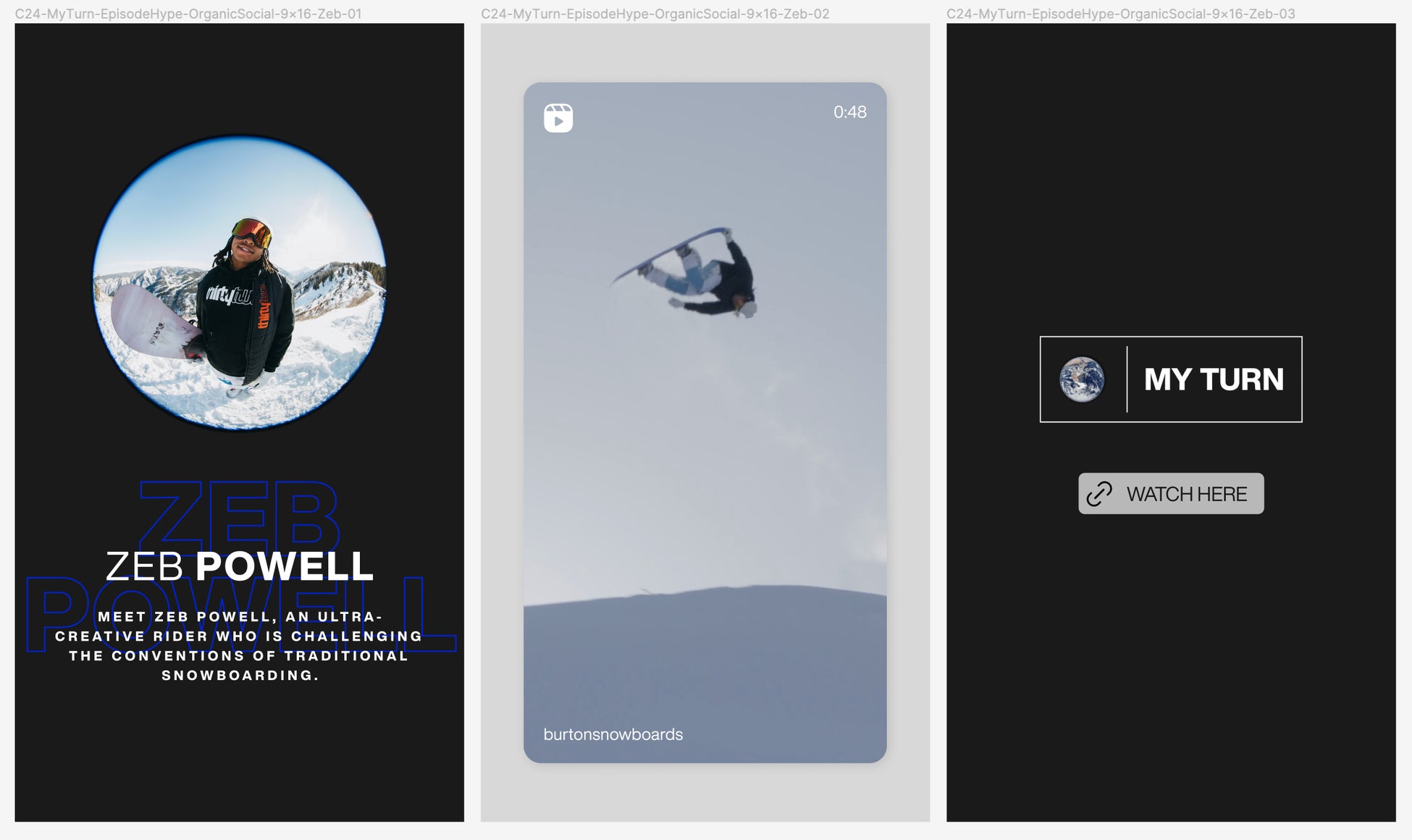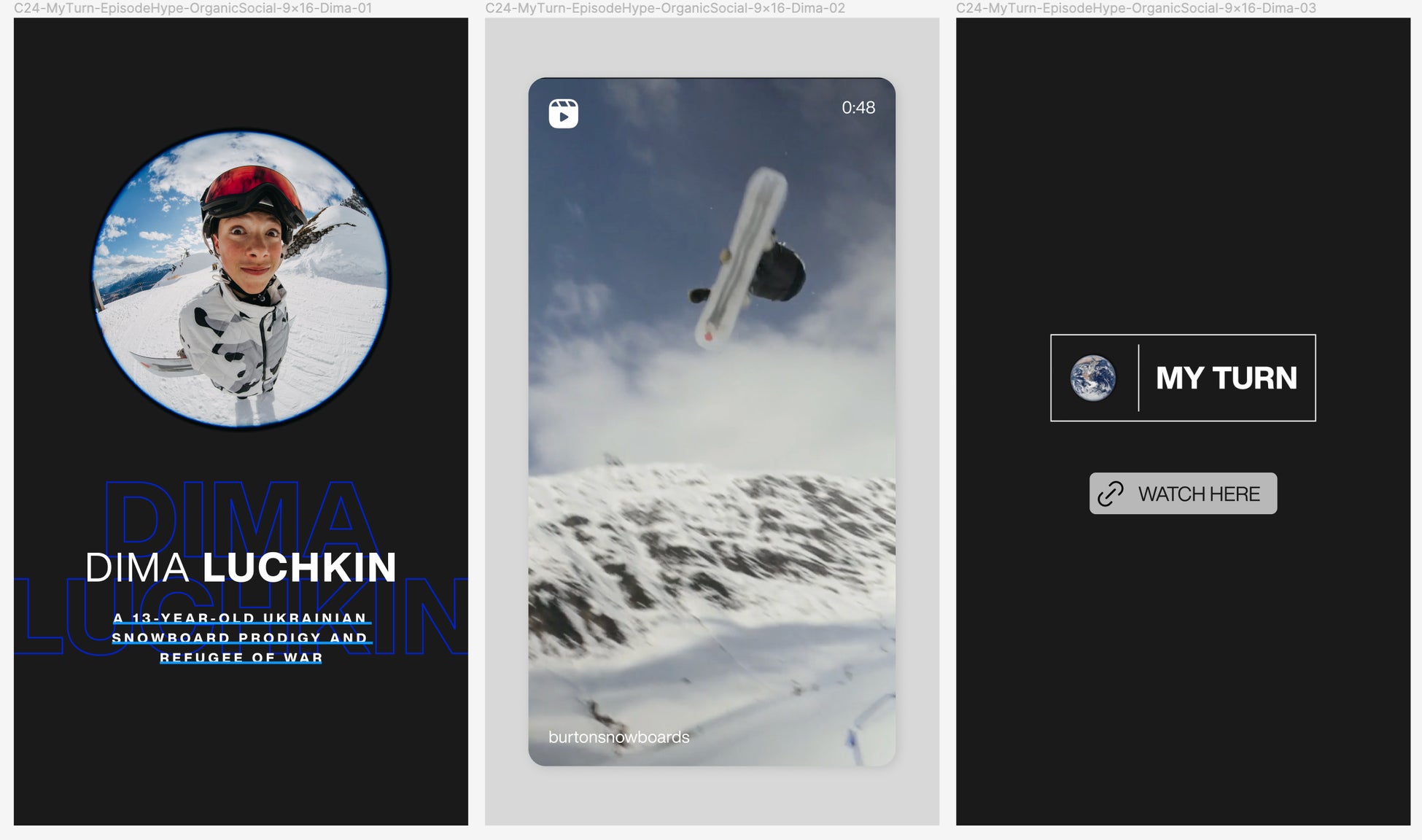 「MY TURN」の5つのエピソードには、世界中から選ばれたアスリートやストーリーによって構成されています。ディマ・ルチキンは、13歳の天才スノーボーダーで、ウクライナ人です。戦争によって故郷を失った難民として、オーストリアのインスブルックで家族とともに暮らしています。リウ・ジアウは、中国に初めてスノーボード競技のオリンピックメダルを持ち帰りました。これは、カンフーから始まった彼女のスノーボード人生における、思いがけない旅のハイライトでした。スイスLAAXリゾートを経営するレト・グルトナー氏は、世界中のリゾートにおけるサステナビリティの基準を推進しています。人気のフリースタイラーであるゼブ・パウエルは、スポーツが進むべき未来そのものの変革をリードしています。そして、Burton の Culture Shifters イベントにおいて、マセケラはスノーボードコミュニティをより多様で包括的なものにするために、その方法についての議論をモデレートしています。