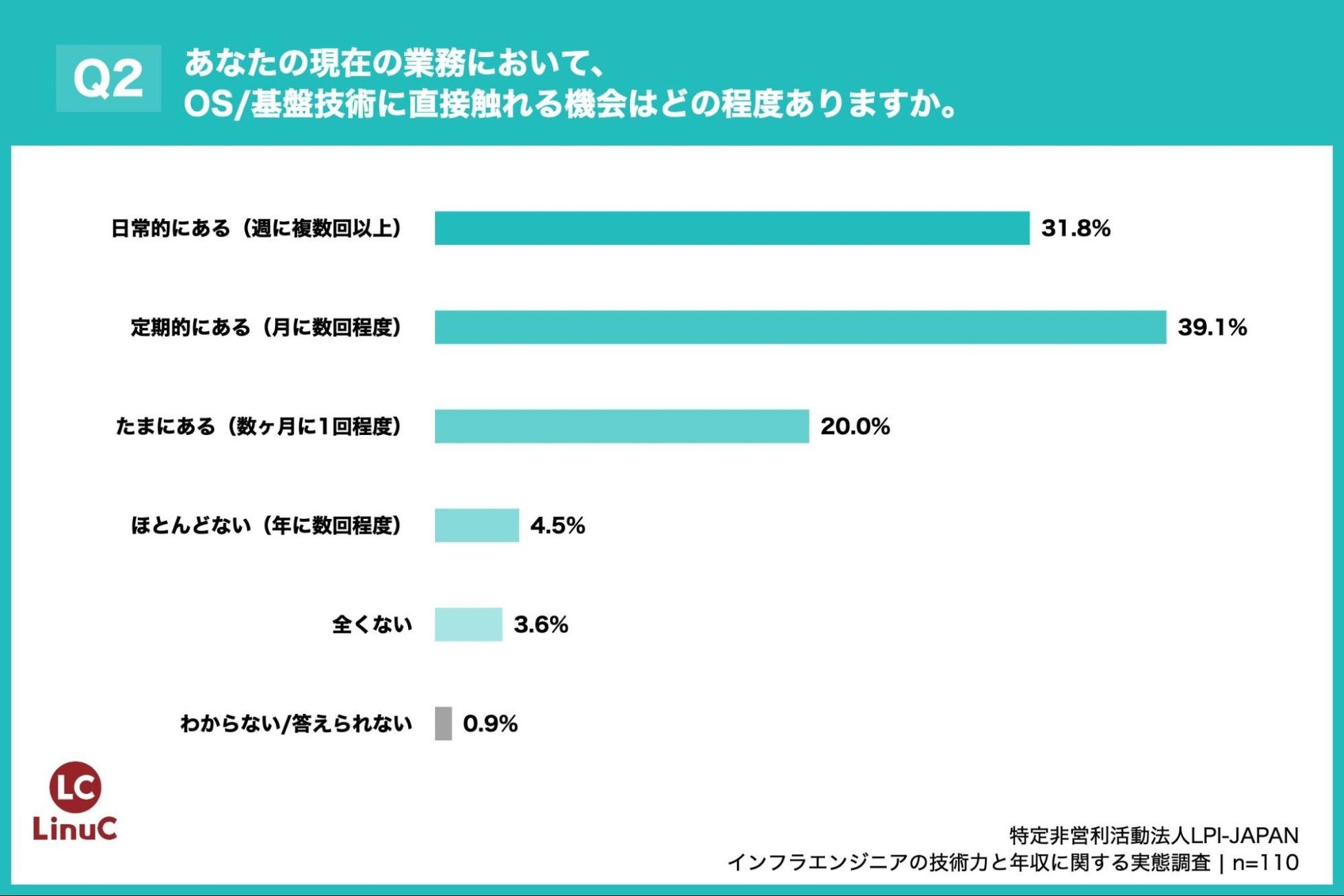 「Q2. あなたの現在の業務において、OS/基盤技術(Linuxカーネル、プロセス管理、ネットワーク設定など)に直接触れる機会はどの程度ありますか。」(n=110)と質問したところ、「日常的にある(週に複数回以上)」が31.8%、「定期的にある(月に数回程度)」が39.1%という回答となりました。