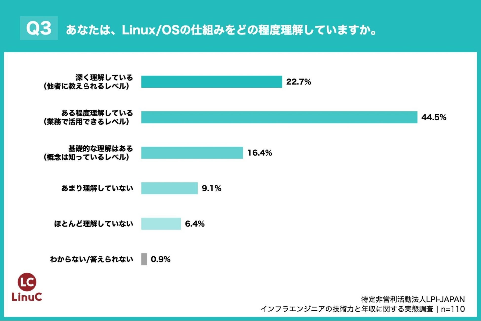 「Q3. あなたは、Linux/OSの仕組み(カーネル、プロセス管理、ファイルシステムなど)をどの程度理解していますか。」(n=110)と質問したところ、「深く理解している(他者に教えられるレベル)」が22.7%、「ある程度理解している(業務で活用できるレベル)」が44.5%という回答となりました。