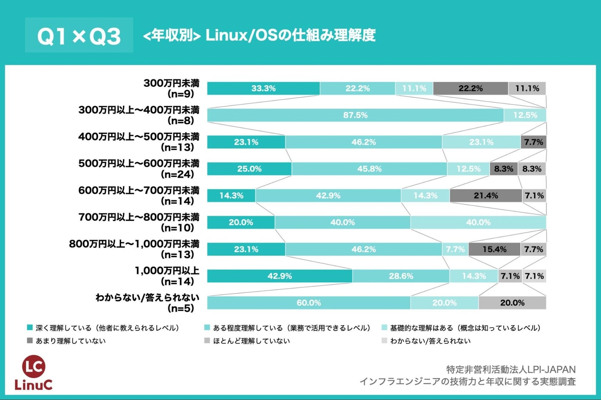 年収別にLinux/OSの仕組みについての理解度を見ると、年収「1,000万円以上」では「深く理解している(他者に教えられるレベル)」が42.9%と、突出している結果となりました。