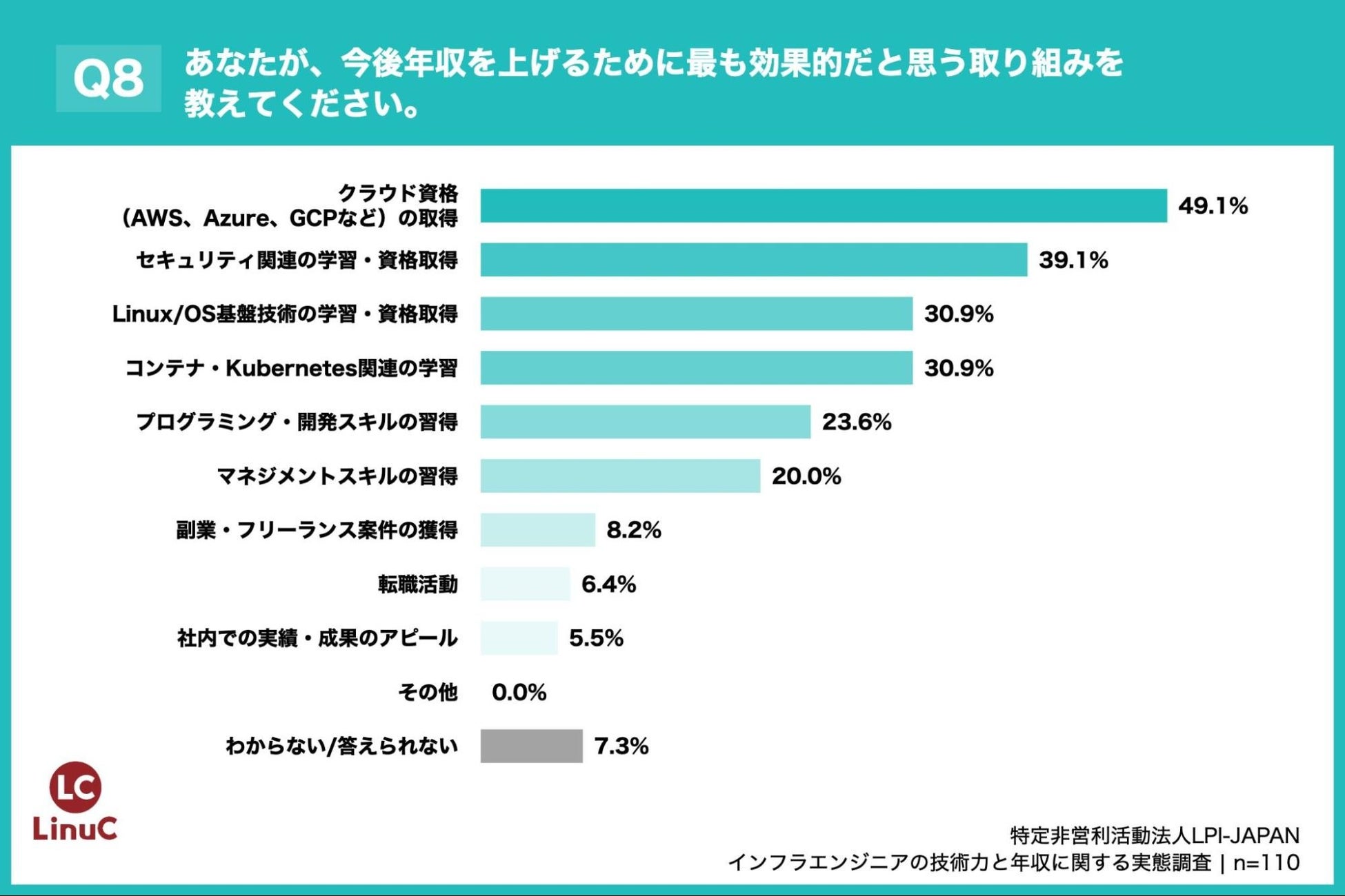 「Q8. あなたが、今後年収を上げるために最も効果的だと思う取り組みを教えてください。(上位3つまで回答可)」(n=110)と質問したところ、「クラウド資格(AWS、Azure、GCPなど)の取得」が49.1%、「セキュリティ関連の学習・資格取得」が39.1%という回答となりました。