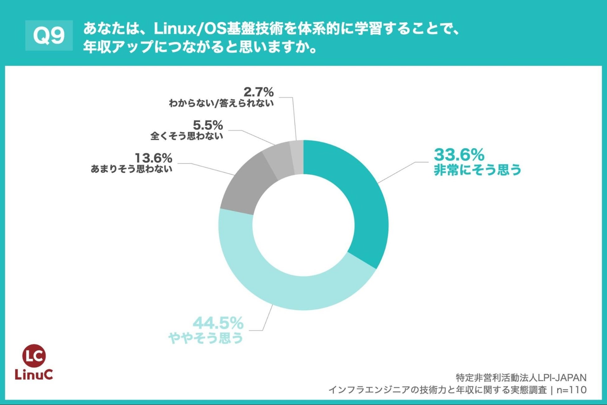 「Q9. あなたは、Linux/OS基盤技術を体系的に学習することで、年収アップにつながると思いますか。」(n=110)と質問したところ、「非常にそう思う」が33.6%、「ややそう思う」が44.5%という回答となりました。