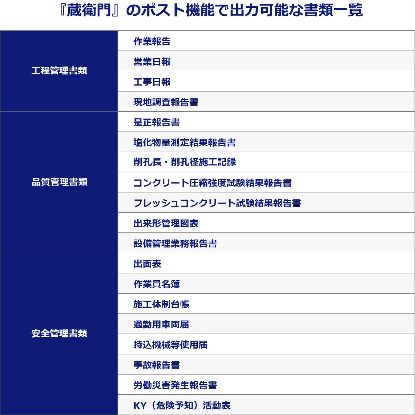クラウド報告管理「ポスト」機能は、現場作業員側はアカウント登録やアプリインストールも不要、人数無制限で利用できます。スマートフォンで指定のURLまたはQRコードにアクセスし、フォームに必要情報を入力して送信。現場監督は『蔵衛門』に集まってくる情報を一覧で確認でき、提出する書類も自動で完成します。フォームの質問内容は自由に変更可能でカスタマイズ性も高いです。「ポスト」で利用できるコンクリート検査テンプレートとして、第一弾は「削孔長・削孔径施工記録」を公開しました。今後は、「コンクリート圧縮強度試験結果報告書」「フレッシュコンクリート試験結果報告書」などのテンプレートを順次追加していく予定です。