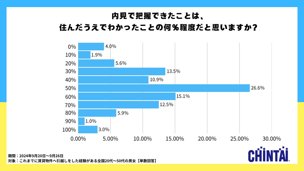 「内見で把握できたことは、住んだうえでわかったことの何%程度だと思いますか?」という質問に対し、最も多かった回答は「50%」で26.6%を占めました。次いで「60%」が15.1%、「30%」が13.5%と続き、多くの人が内見時点では、住んでみてからわかることの半分程度しか把握できていないと感じているようです。