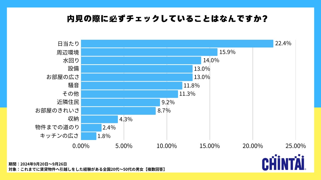 ・内見時は「日当たり」(22.4%)が最も重視され、「周辺環境」(15.9%)や「水回り」(14.0%)が続きました。