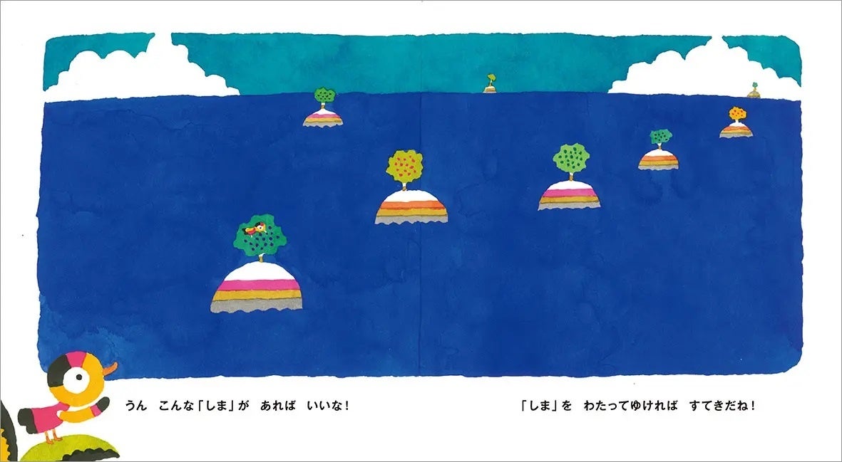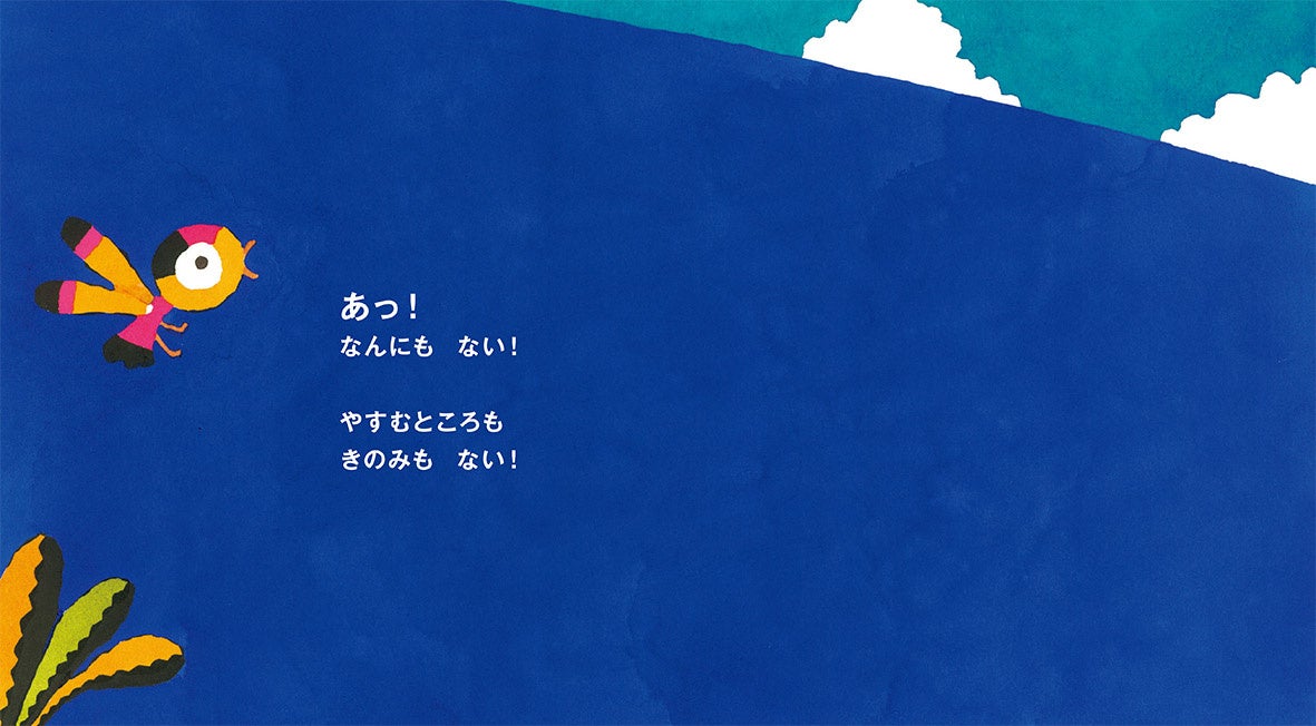 森のなかを飛ぶ小鳥。小鳥は、まだ小さいので、あまり長くは飛べません。飛んでは、やすみ、木の実を食べて、また飛んで、やすんで……、と少しずつ進んでいきます。森を抜けたと思ったら……あっ!! 小鳥の視界いっぱいに、大海原が広がっていたのです。途中で休むところも、木の実もない海を渡るには、どうすればよいのでしょうか。小鳥は一生懸命考えます。