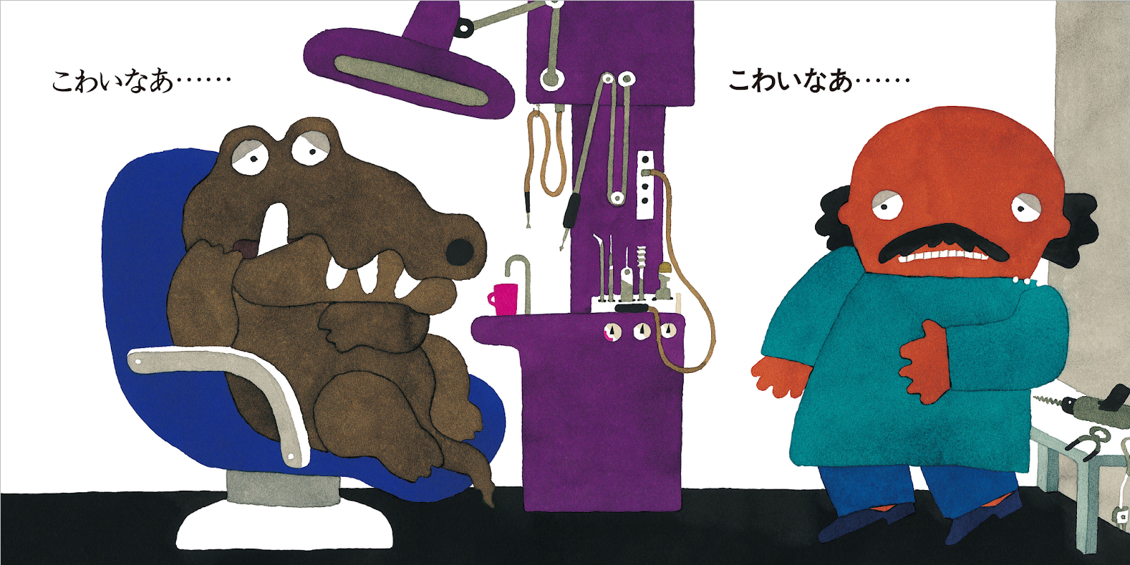 虫歯が痛いわにさんと治療をする歯医者さん。同じ場面で同じ言葉を言います。それぞれの心理の違いを絵で表現したゆかいな絵本。