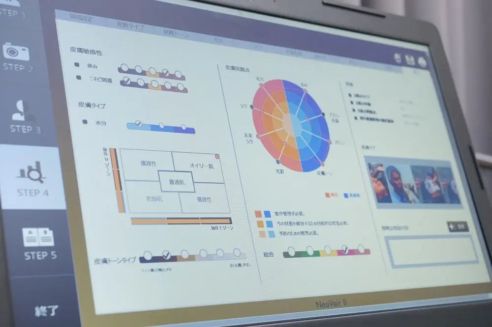 4種類のLED光源による撮影データを用いて、毛穴やシワ・肌色トーン・肌弾力や水分量などを測定し分析、未来シミの可視化や肌年齢など詳細を確認することができます。肌状態を数値化し分析することで、日常生活での改善策の指標として活用いただけます。