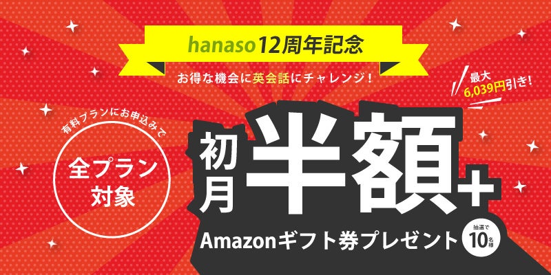 株式会社アンフープ(所在地:静岡県富士市、代表取締役社長:重森 渉)がサイト運営する、無料通話ソフトZoomまたはSkypeを利用したオンライン英会話スクール「hanaso」では、2022年2月17日(木) ~3月8日(火)に、新規入会者・再入会者を対象として全てのプラン初月月額料金(4,400円~12,078円)(税込)が半額&抽選で10名様に3,000円のギフト券プレゼントの「12周年記念キャンペーン」を実施いたします。