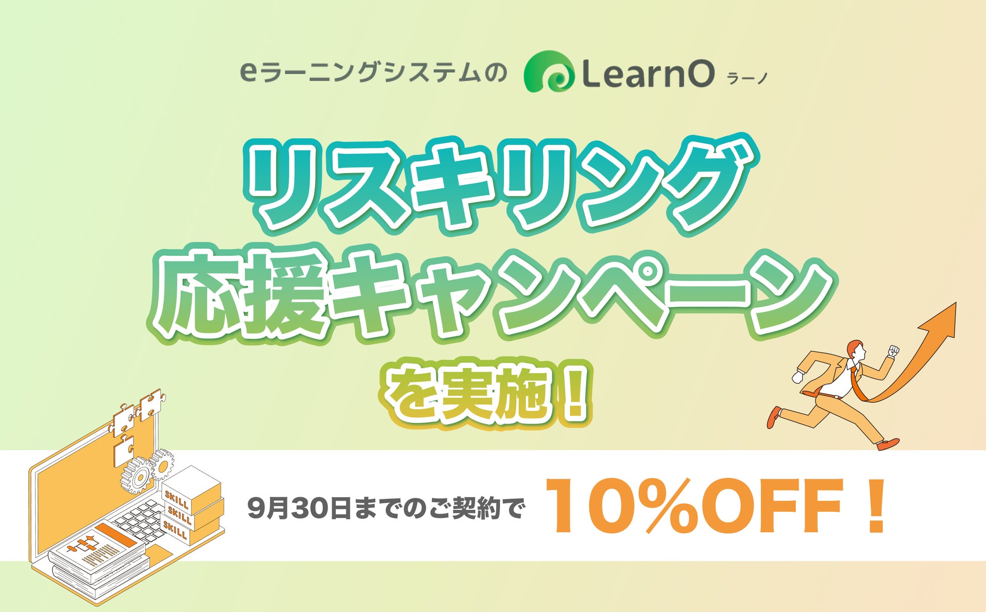 期間中、LearnOをご契約いただくと月額利用料が10%OFFでご利用いただけるキャンペーンとなり、期間は本日から9月30日までとなります。