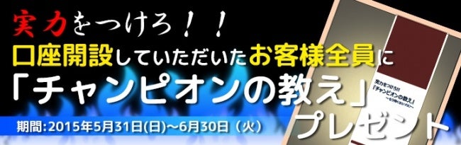 当社では2015年5月31日(日)より新規に口座開設頂いたお客様を対象に、「チャンピオンの教え」~もう怖くないFX~のプレゼントキャンペーンを実施いたします。