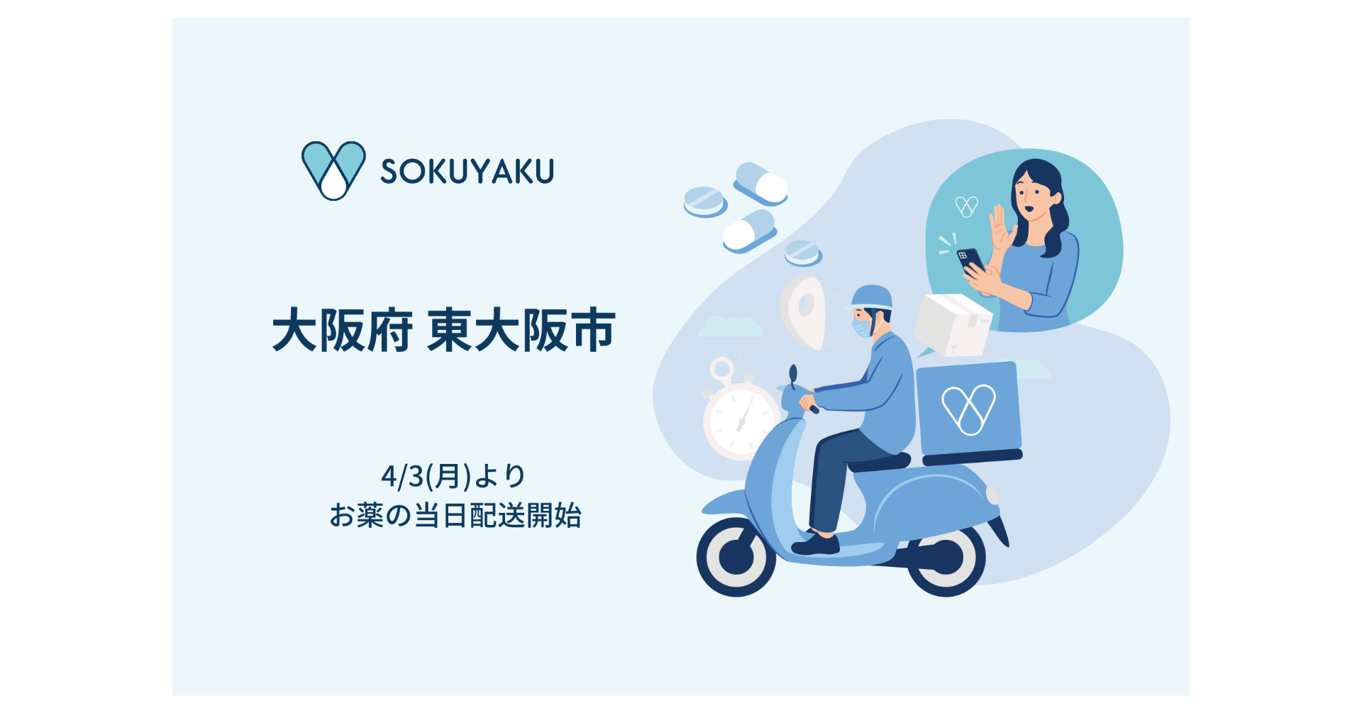 これまで、「SOKUYAKU」では2021年9月より大阪市で処方薬当日配送サービスを提供してまいりました。※1 2023年4月3日(月)より対応エリアが拡大し、大阪府では2つの市でサービスを提供いたします。