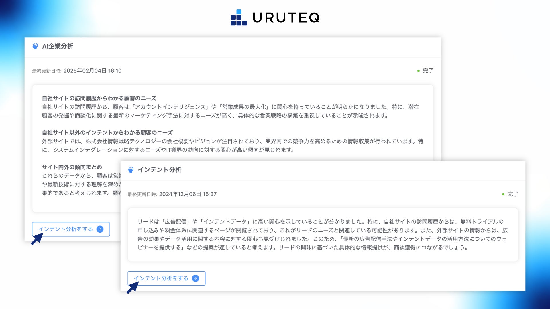 ログリー株式会社(本社:東京都渋谷区、代表取締役:吉永浩和、証券コード:6579、以下、ログリー)が提供するアカウントインテリジェンスツール※1「ウルテク( https://uruteq.logly.co.jp/ )」は、自社サイトだけでなくサイト外の検索意図や興味・関心データをAIで解析する「AIインテント分析」機能の提供を2025年2月6日(木)に開始しました。この機能によってオンラインデータ分析の手間を大幅に削減しながら、顧客企業が「いま」求めるニーズを捉え、より効果的なマーケティングやセールス活動を実施できるようになります。